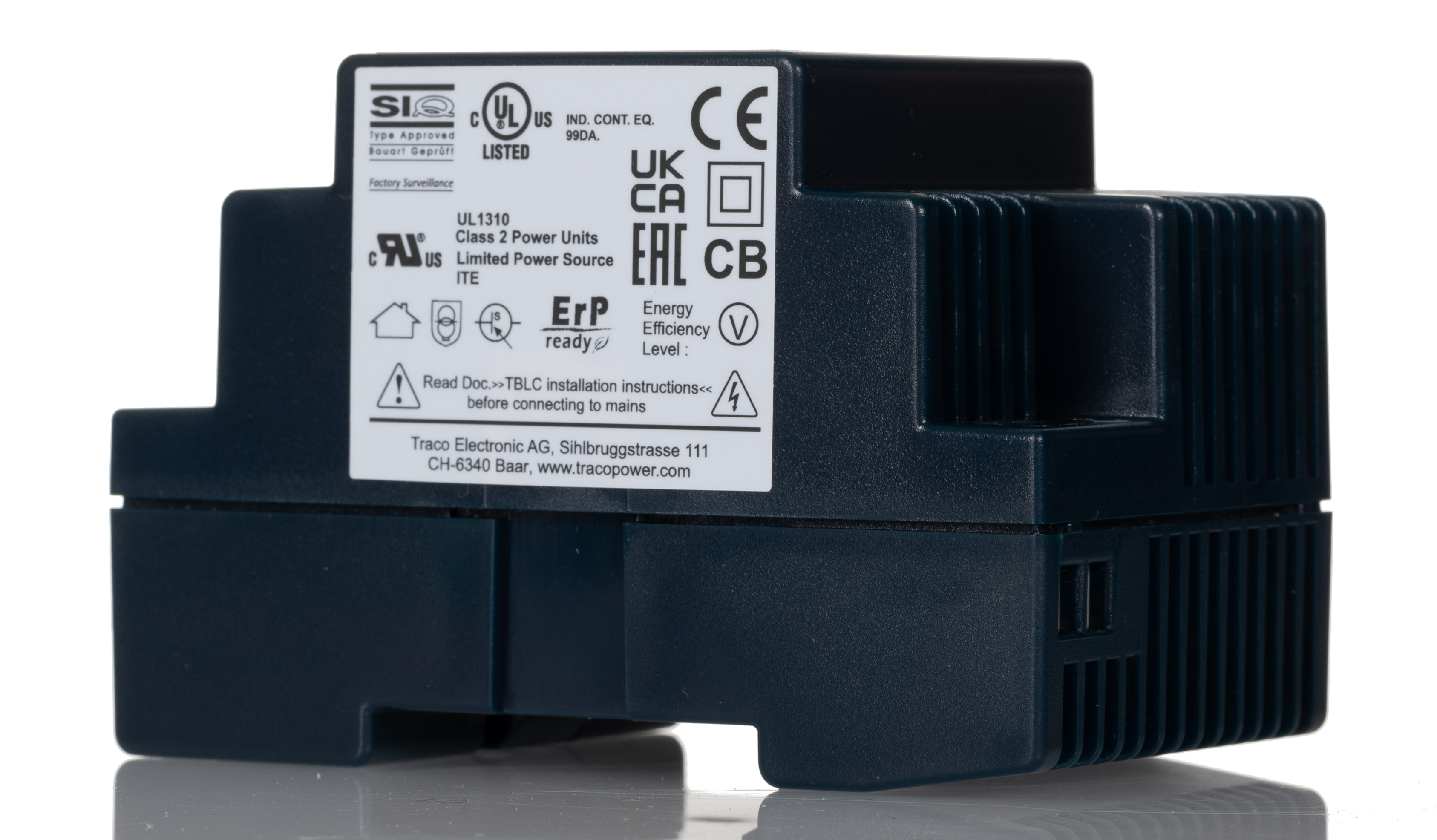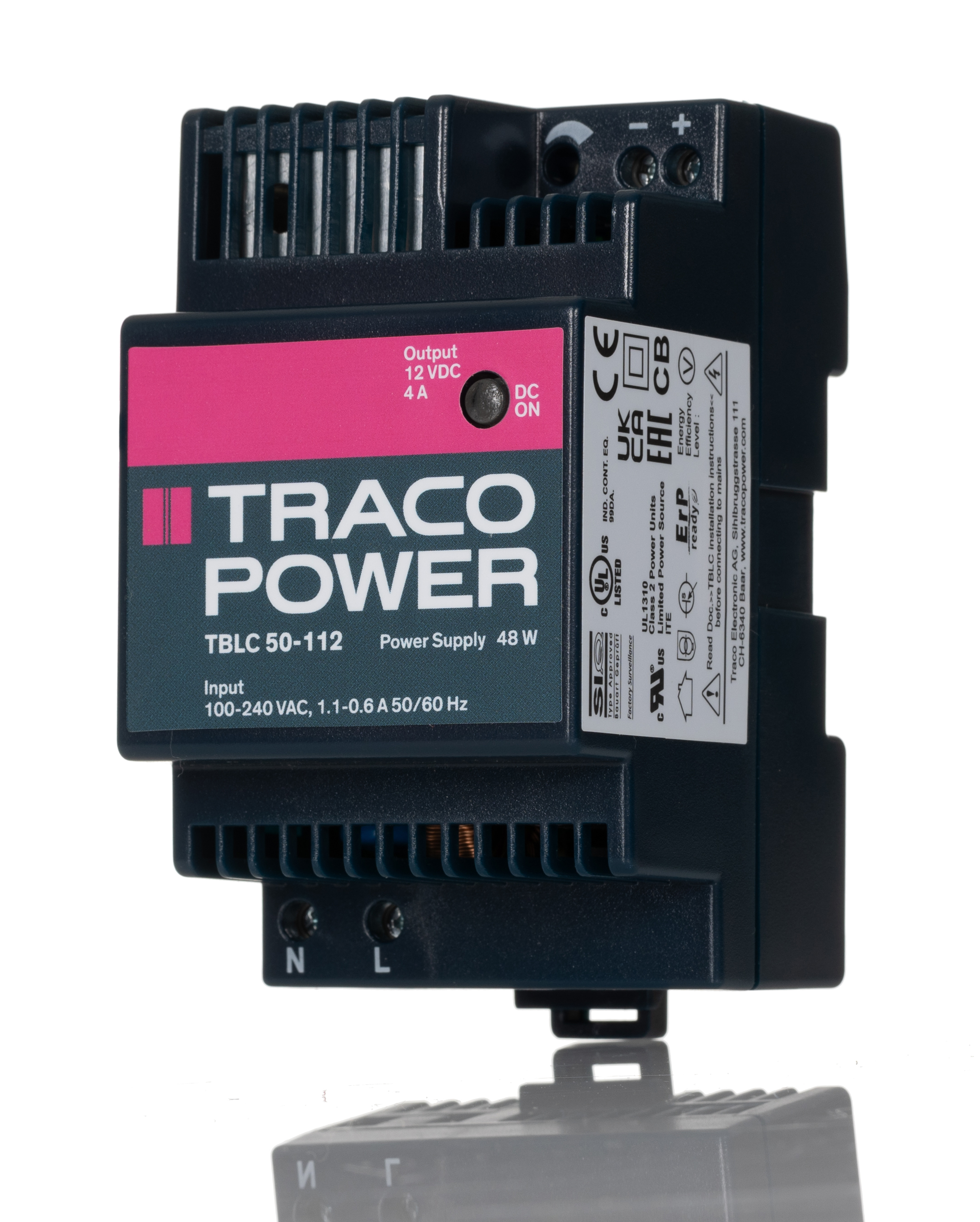 This is TBLC DIN Rail Power Supply 48W 4A manufactured by TRACOPOWER. The manufacturer part number is TBLC 50-112. The product has +70°c maximum temperature. It has a/an dc output voltage . The given dimensions of the product include 89.5 x 18 x 59.5mm. While its minimum temperature is -25°c. It has ac input voltage. Furthermore, the product is 59.5mm wide. The MTBF values include 1900000h. Its electrical phase configuration includes 1. Load Regulation - 0.3%. The product complies with all safety standards, such as erp compliant. It is a highly efficient product with an 88% of high efficiency. Its input voltage is 85 → 264v ac. Additionally, the product is supplied with 1 outputs. It has 12 → 16v of output voltage adjustment range. Carries 50mv pk-pk ripple and noise. The product comes in 59.5mm depth. The product also provides special features, such as adjustable output voltage, compliant to new standby power & efficiency requirements, low output ripples & spikes. The product is available in din rail mount configuration. It carries 4a output current. The product tblc, is a highly preferred choice for users. In addition, the height is 89.5mm. Features a 12v dc output voltage.