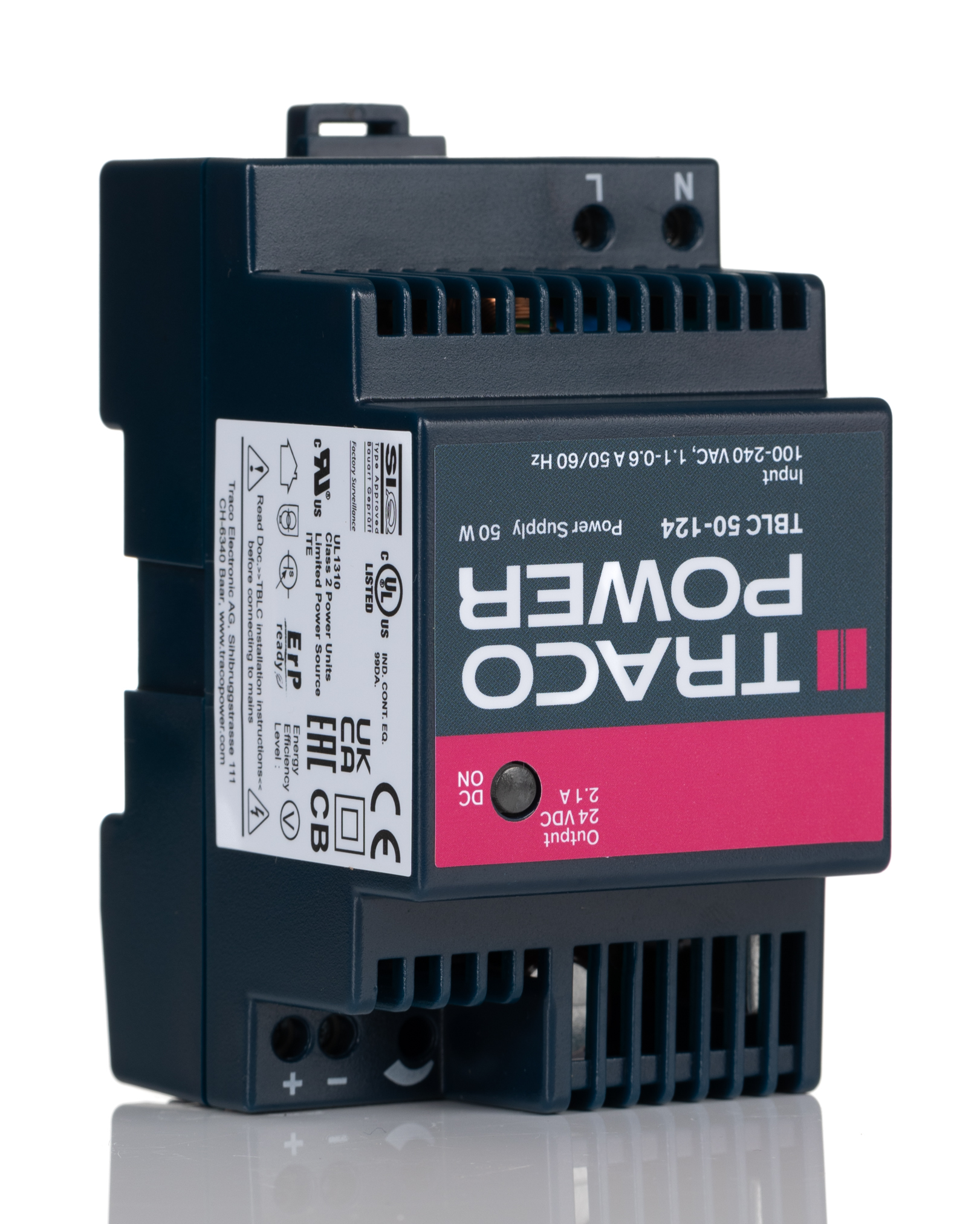 This is TBLC DIN Rail Power Supply 50W 2.1A manufactured by TRACOPOWER. The manufacturer part number is TBLC 50-124. The product has +70°c maximum temperature. It has a/an dc output voltage . The given dimensions of the product include 89.5 x 18 x 59.5mm. While its minimum temperature is -25°c. It has ac input voltage. Furthermore, the product is 54mm wide. The MTBF values include 1900kh. Its electrical phase configuration includes 1. It comes in switched mode configuration. Load Regulation - 0.3%. The product complies with all safety standards, such as erp compliant. It is a highly efficient product with an 89% of high efficiency. Its input voltage is 85 → 264v ac. Additionally, the product is supplied with 1 outputs. It has 24 → 28v of output voltage adjustment range. Carries 50mv pk-pk ripple and noise. The product comes in 89.5mm depth. The product also provides special features, such as adjustable output voltage, compliant to new standby power & efficiency requirements, low output ripples & spikes. The product is available in din rail mount configuration. It carries 2.1a output current. The product tblc 50, is a highly preferred choice for users. In addition, the height is 59.5mm. Features a 24v dc output voltage.