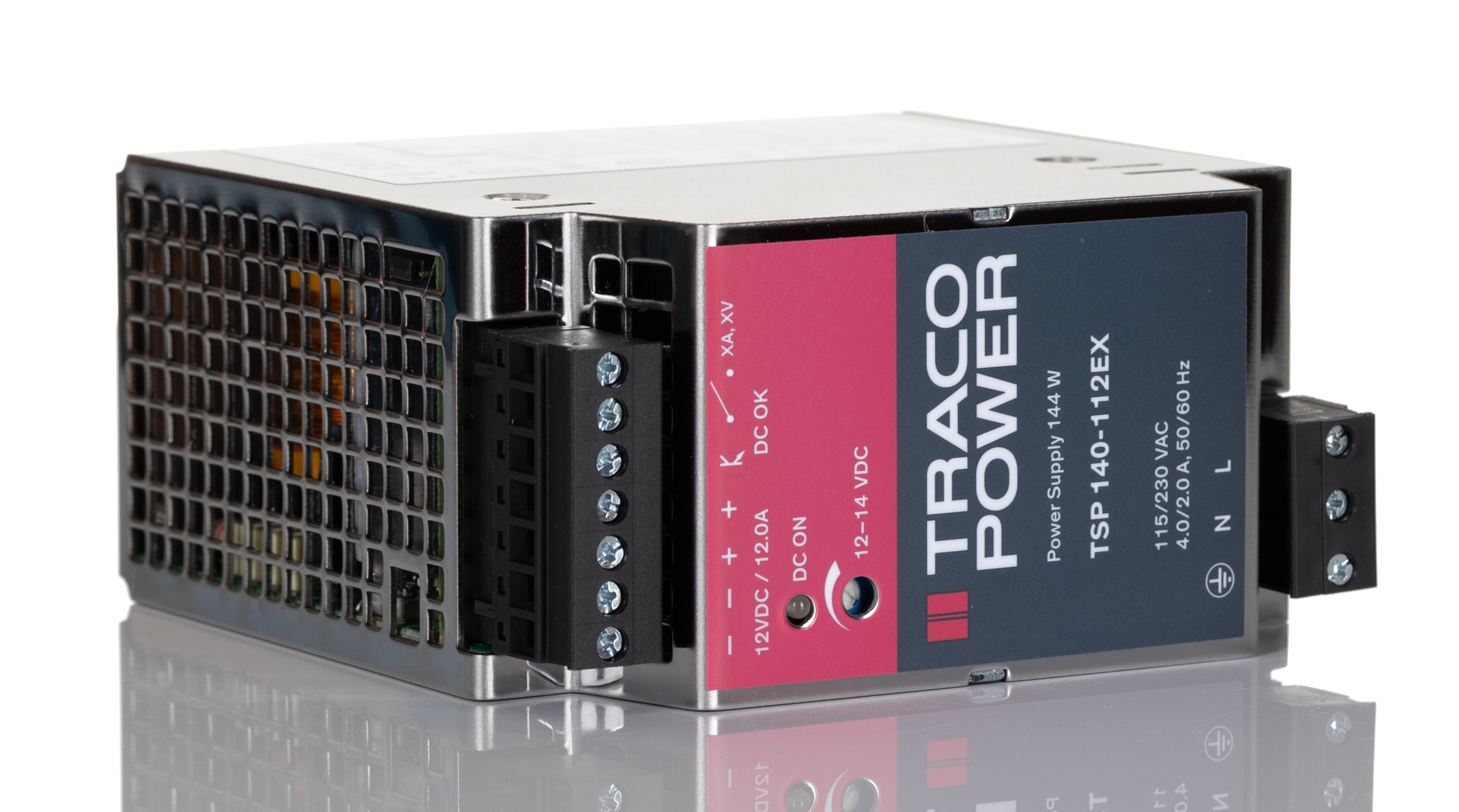 This is TSP Switch Mode DIN Rail Panel Mount Power Supply 144W 12V dc/ 12A manufactured by TRACOPOWER. The manufacturer part number is TSP 140-112 EX. The product has +70°c maximum temperature. It has a/an dc output voltage . The given dimensions of the product include 110 x 54 x 110mm. While its minimum temperature is -25°c. It has ac input voltage. Furthermore, the product is 54mm wide. The MTBF values include 1200000h. It comes in switched mode configuration. Load Regulation - ±0.5%. The product complies with all safety standards, such as ce. It is a highly efficient product with an 87% of high efficiency. Its input voltage is 85 → 264v ac. Additionally, the product is supplied with 1 outputs. It has 12 → 16v of output voltage adjustment range. Carries 200mv pk-pk ripple and noise. The product comes in 110mm depth. The product also provides special features, such as 3-years warranty. The product is available in din rail mount configuration. It carries 12a output current. The product tsp, is a highly preferred choice for users. In addition, the height is 110mm. Features a 12v dc output voltage.