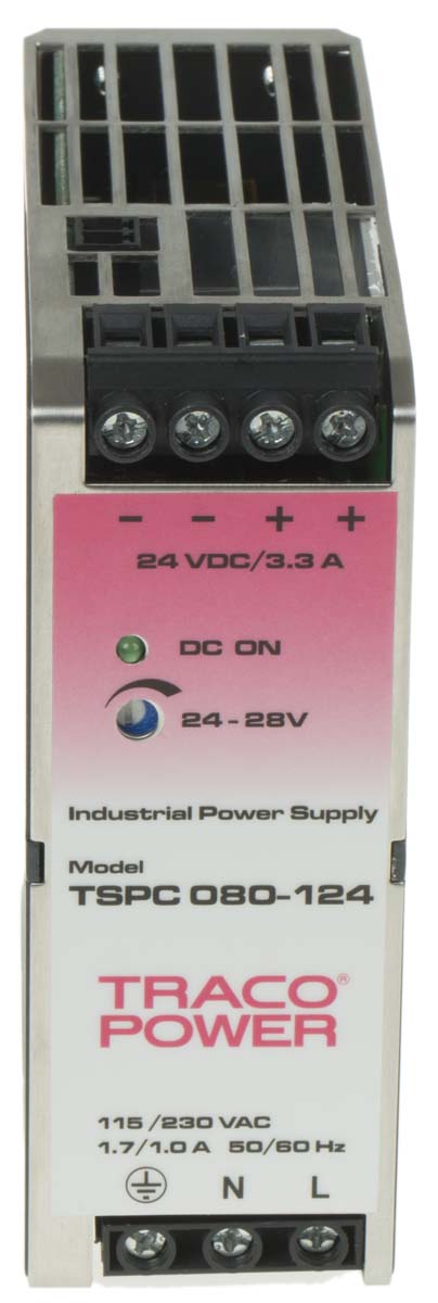 This is TSPC DIN Rail Panel Mount Power Supply Switch Mode 80W 24V dc/ 3.3A manufactured by TRACOPOWER. The manufacturer part number is TSPC 080-124. The product has +70°c maximum temperature. It has a/an dc output voltage . The given dimensions of the product include 110 x 40 x 110mm. While its minimum temperature is -25°c. It has ac input voltage. Furthermore, the product is 40mm wide. The MTBF values include 2400000h. Its electrical phase configuration includes 1. It comes in switched mode configuration. Load Regulation - ±1%. The product complies with all safety standards, such as en 60950-1. It is a highly efficient product with an 92% of high efficiency. Its input voltage is 85 → 132v ac. Additionally, the product is supplied with 1 outputs. Carries 100mv pk-pk ripple and noise. The product comes in 110mm depth. The product is available in din rail mount configuration. It carries 3.3a output current. The product tspc, is a highly preferred choice for users. In addition, the height is 110mm. Features a 24v dc output voltage.