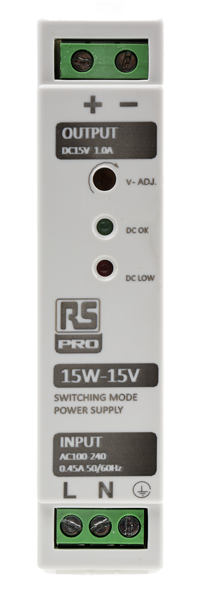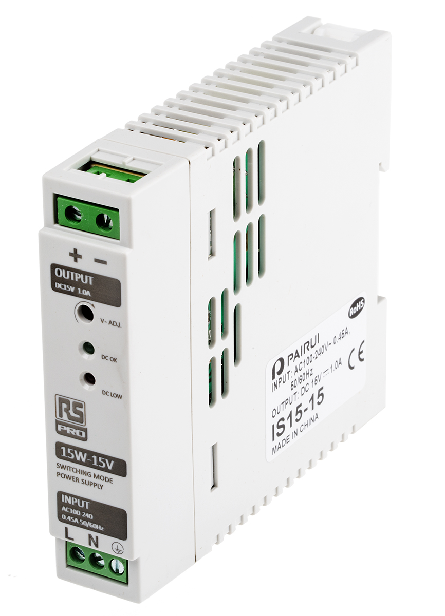 This is AC-DC Switching Power Supply DIN Rail Power Supply 15W 15V dc/ manufactured by RS Pro. The manufacturer part number is 136-8302. Additionally, the product is supplied with 1 outputs. Load Regulation - 1%. It carries 1a output current. The given dimensions of the product include 22.5 x 95 x 108mm. The product is available in din rail mount configuration. The product has +70°c maximum temperature. While its minimum temperature is -25°c. Its electrical phase configuration includes 1. In addition, the height is 95mm. Furthermore, the product is 22.5mm wide. The product comes in 108mm depth. The MTBF values include 200kh. Features a 15v dc output voltage. It has a/an dc output voltage . The product also provides special features, such as 100% full load burn-in test, 3-years warranty, compact size, cooling by free air convection, led indicator for dc low, led indicator for dc power on. It comes in switched mode configuration. Its input voltage is 230v ac. The product complies with all safety standards, such as cb, ce, cul, culus recognised, fcc, ul.