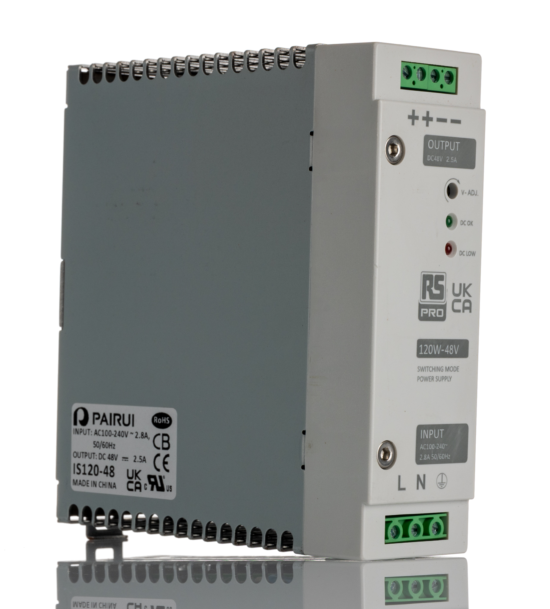 This is AC-DC Switching Power Supply DIN Rail Power Supply 120W 48V dc/ 2.5A manufactured by RS Pro. The manufacturer part number is 136-8320. Additionally, the product is supplied with 1 outputs. It has 47 → 55v of output voltage adjustment range. Load Regulation - 3%. It carries 2.5a output current. The given dimensions of the product include 40 x 130 x 125mm. The product is available in din rail mount configuration. The product has +70°c maximum temperature. While its minimum temperature is -25°c. Its electrical phase configuration includes 1. The product also provides special features, such as 100% full load burn-in test, 3-years warranty, compact size, cooling by free air convection, led indicator for dc low, led indicator for dc power on. In addition, the height is 130mm. Furthermore, the product is 40mm wide. The product comes in 125mm depth. The MTBF values include 200kh. Features a 48v dc output voltage. It has a/an dc output voltage . Carries 240mv ripple and noise. It comes in switched mode configuration. Its input voltage is 230v ac. The product complies with all safety standards, such as cb, ce, cul, culus recognised, fcc, ul.