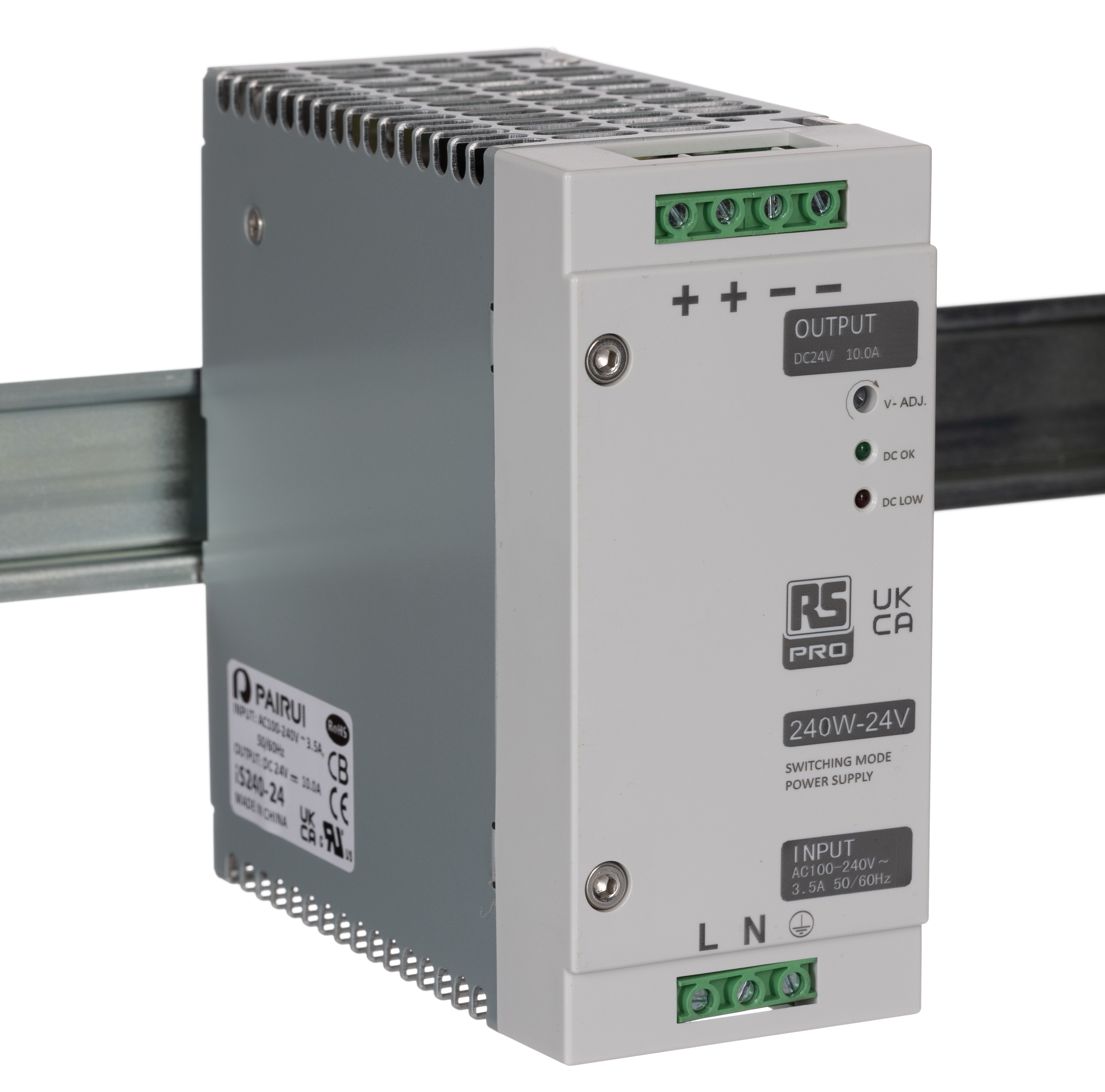 This is AC-DC Switching Power Supply DIN Rail Power Supply 240W 24V dc/ 10A manufactured by RS Pro. The manufacturer part number is 136-8321. Additionally, the product is supplied with 1 outputs. It has 22 → 28v of output voltage adjustment range. Load Regulation - 3%. It carries 10a output current. The given dimensions of the product include 60 x 130 x 125mm. The product is available in din rail mount configuration. The product has +70°c maximum temperature. While its minimum temperature is -25°c. Its electrical phase configuration includes 1. In addition, the height is 130mm. Furthermore, the product is 60mm wide. The product comes in 125mm depth. The MTBF values include 230kh. Features a 24v dc output voltage. It has a/an dc output voltage . The product also provides special features, such as 100% full load burn-in test, 3-years warranty, compact size, cooling by free air convection, led indicator for dc low, led indicator for dc power on. It comes in switched mode configuration. Its input voltage is 230v ac. The product complies with all safety standards, such as cb, ce, cul, culus recognised, fcc, ul.