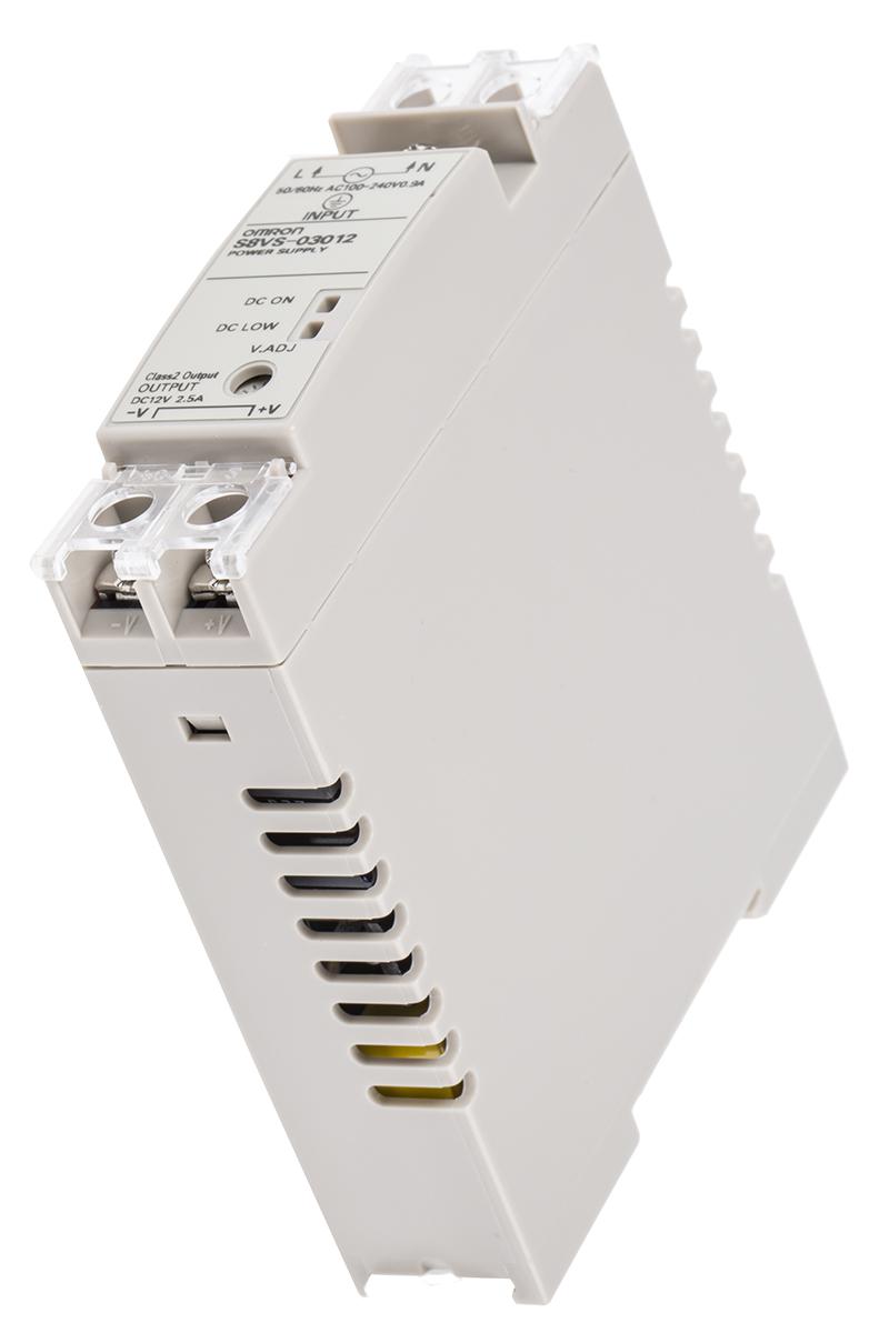 This is S8VS Switch Mode DIN Rail Panel Mount Power Supply 30W 12V dc/ 2.5A manufactured by Omron. The manufacturer part number is S8VS03012. Additionally, the product is supplied with 1 outputs. Load Regulation - ±2%. It carries 2.5a output current. The given dimensions of the product include 96.4 x 22.5 x 94.6mm. The product is available in din rail mount configuration. It is a highly efficient product with an 76% of high efficiency. The product has +60°c maximum temperature. The product s8vs, is a highly preferred choice for users. Its electrical phase configuration includes 1. It has ac input voltage. In addition, the height is 85mm. Furthermore, the product is 22.5mm wide. The product comes in 96.4mm depth. The MTBF values include 135000h. Features a 12v dc output voltage. While its minimum temperature is -10°c. It has a/an dc output voltage . Feature 30w of power rating. Carries ±2% ripple and noise. It comes in switched mode configuration. Its input voltage is 85 → 264v ac.