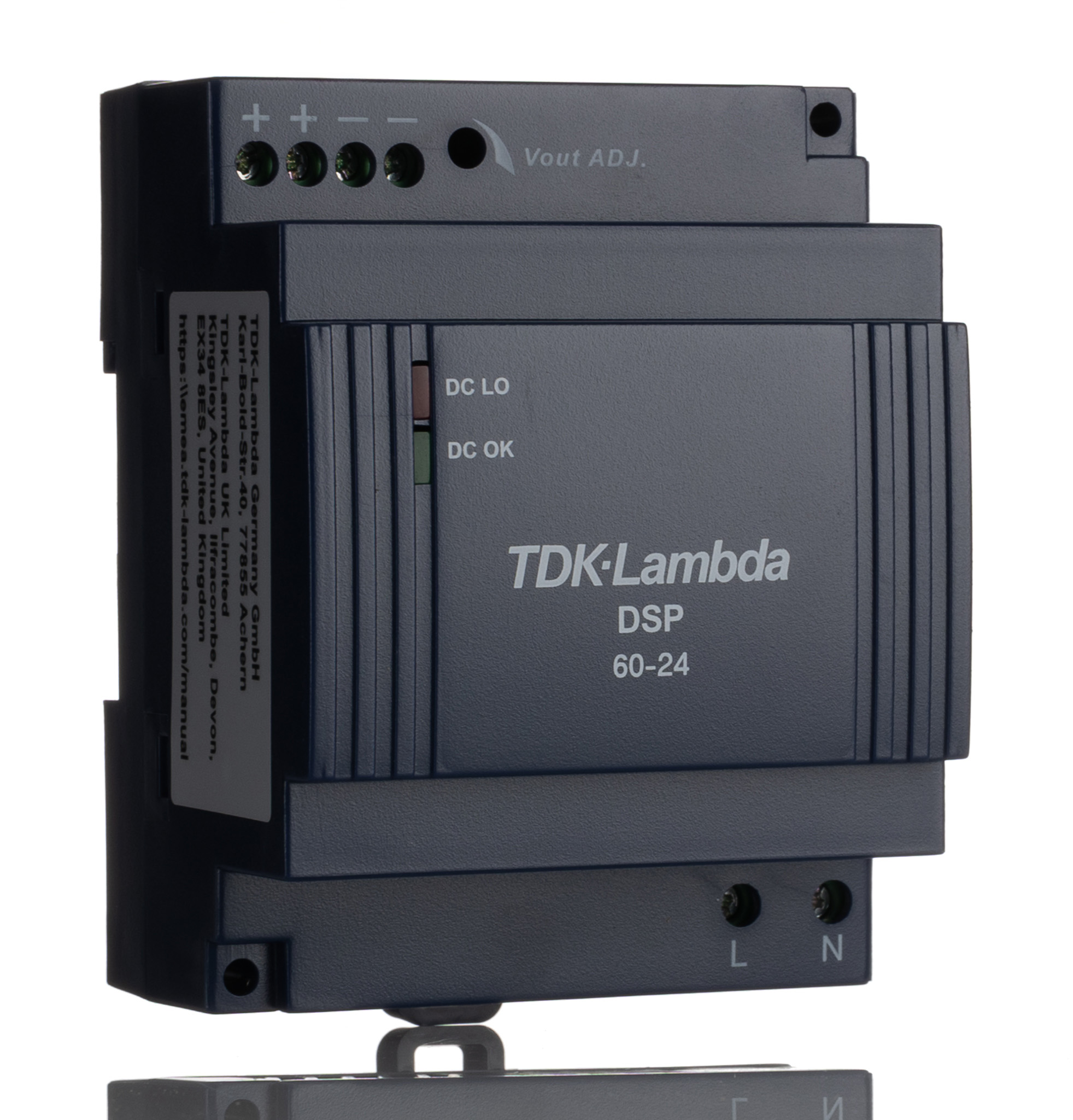 This is DSP DIN Rail Power Supply 60W Maximum of 24V dc/ 2.5A manufactured by TDK-Lambda. The manufacturer part number is DSP-60-24. Additionally, the product is supplied with 1 outputs. It has 24 → 28v of output voltage adjustment range. Load Regulation - 1%. It has a/an dc output voltage . The given dimensions of the product include 71 x 55.6 x 91mm. The product is available in din rail mount configuration. The product has +71°c maximum temperature. The product dsp, is a highly preferred choice for users. Its electrical phase configuration includes 1. It has ac, dc input voltage. In addition, the height is 91mm. Furthermore, the product is 71mm wide. The product comes in 55.6mm depth. Its input voltage is 90 → 264 v ac / 120 →370v dc. Features a 24v dc output voltage. While its minimum temperature is -25°c. Carries 50mv ripple and noise. It comes in switched mode configuration. It carries 2.5a output current. The product complies with all safety standards, such as ce, en 55022, en 60950-1, en 61000-3-2, en 61000-3-3, en 61000-4-11, en 61000-4-2, en 61000-4-3, en 61000-4-4, en 61000-4-5, en 61000-4-6, en 61000-4-8, iec 60068-2-27, iec 60068-2-6, ul 1310 class 2, ul 508, ul 60950-1, ul 94 v-0.