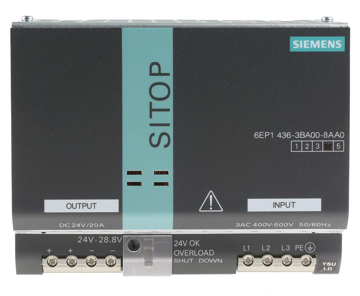 This is Switch Mode DIN Rail Panel Mount Power Supply 480W 24V dc/ 20A manufactured by Siemens. The manufacturer part number is 6EP1436-3BA00-8AA0. The product has +70°c maximum temperature. It has a/an dc output voltage . The given dimensions of the product include 160 x 125 x 125mm. While its minimum temperature is 0°c. It has ac input voltage. Furthermore, the product is 160mm wide. The MTBF values include 711213h. Its electrical phase configuration includes 3. It comes in switched mode configuration. Load Regulation - 0.2%. The product complies with all safety standards, such as ce, csa certified, ul. It is a highly efficient product with an 90% of high efficiency. Its input voltage is 320 → 550v ac. Additionally, the product is supplied with 1 outputs. It has 24 → 28.8v of output voltage adjustment range. Carries 100mv pk-pk ripple and noise. The product comes in 125mm depth. The product is available in din rail mount configuration. It carries 20a output current. The product sitop modular plus, is a highly preferred choice for users. In addition, the height is 125mm. Features a 24v dc output voltage. Feature 480w of power rating.