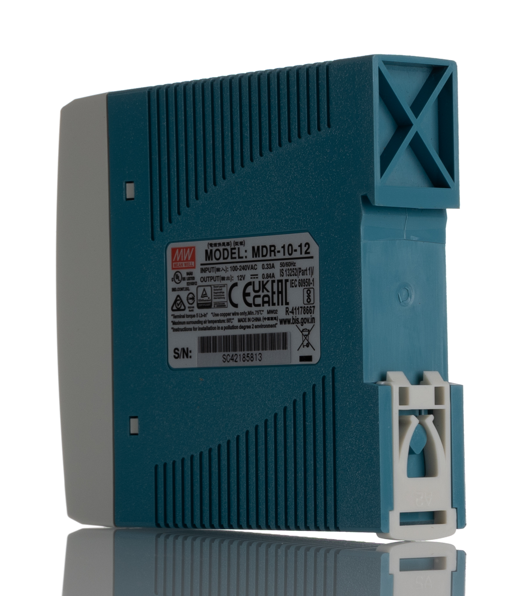 This is Switch Mode DIN Rail Panel Mount Power Supply 10W 12V dc/ 840mA manufactured by Mean Well. The manufacturer part number is MDR-10-12. The product has +70°c maximum temperature. It has a/an dc output voltage . The given dimensions of the product include 100 x 22.5 x 90mm. While its minimum temperature is -20°c. It has ac input voltage. Furthermore, the product is 22.5mm wide. The MTBF values include 584000h. Its electrical phase configuration includes 1. It comes in switched mode configuration. Load Regulation - ±3%. The product complies with all safety standards, such as rohs compliant, tuv en 60950-1, ul 508. Its input voltage is 85 → 264v ac. Additionally, the product is supplied with 1 outputs. It has 4.75 → 5.5v of output voltage adjustment range. Carries 120mv pk-pk ripple and noise. The product comes in 90mm depth. The product also provides special features, such as overvoltage and short circuit protection. The product is available in din rail mount configuration. It carries 840ma output current. The product mdr, is a highly preferred choice for users. In addition, the height is 100mm. Features a 12v dc output voltage.