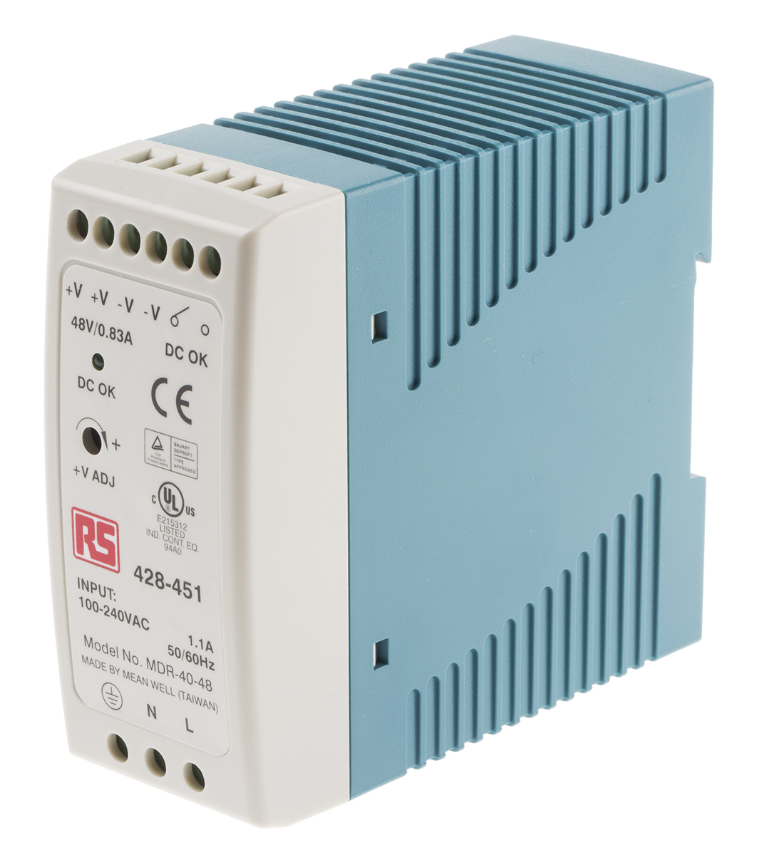 This is Switch Mode DIN Rail Panel Mount Power Supply 39.8W 48V dc/ 830mA manufactured by Mean Well. The manufacturer part number is MDR-40-48. The product has +70°c maximum temperature. It has a/an dc output voltage . The given dimensions of the product include 100 x 40 x 90mm. While its minimum temperature is -20°c. It has ac input voltage. Furthermore, the product is 40mm wide. The MTBF values include 301.7kh. Its electrical phase configuration includes 1. It comes in switched mode configuration. Load Regulation - ±1%. The product complies with all safety standards, such as rohs compliant, tuv en 60950-1, ul 508. Its input voltage is 85 → 264v ac. Additionally, the product is supplied with 1 outputs. It has 48 → 56v of output voltage adjustment range. Carries 200mv pk-pk ripple and noise. The product is certified with b, c, class i division 2 group a, d hazardous location t4 hazardous area certification. The product comes in 90mm depth. The product also provides special features, such as overvoltage and short circuit protection. The product is available in din rail mount configuration. It carries 830ma output current. The product mdr, is a highly preferred choice for users. In addition, the height is 100mm. Features a 48v dc output voltage.