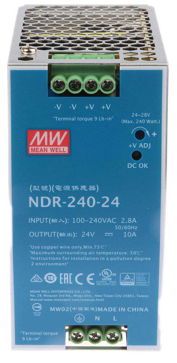 This is NDR-240 DIN Rail Power Supply 240W 24V dc/ 0 → 10A manufactured by Mean Well. The manufacturer part number is NDR-240-24. The product has +70°c maximum temperature. It has a/an dc output voltage . The given dimensions of the product include 125.2 x 63 x 113.5mm. While its minimum temperature is -20°c. It has ac input voltage. Furthermore, the product is 63mm wide. The MTBF values include 230.2kh. Its electrical phase configuration includes 1. It comes in switched mode configuration. Load Regulation - ±1%. The product complies with all safety standards, such as rohs compliant, tuv en 60950-1, ul 508. Its input voltage is 90 → 264v ac. Additionally, the product is supplied with 1 outputs. It has 24 → 28v of output voltage adjustment range. Carries 150mv pk-pk ripple and noise. The product comes in 114mm depth. The product also provides special features, such as overvoltage and short circuit protection. The product is available in din rail mount configuration. It carries 10a output current. The product ndr, is a highly preferred choice for users. In addition, the height is 125mm. Features a 24v dc output voltage. Feature 240w of power rating.