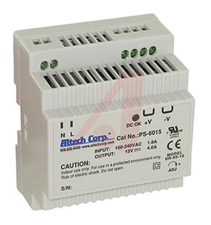This is PS-60 Switch Mode DIN Rail Power Supply 60W 15V dc/ 4A manufactured by Altech. The manufacturer part number is PS-6015. The product has +60°c maximum temperature. It has a/an dc output voltage . While its minimum temperature is -20°c. It has ac, dc input voltage. Furthermore, the product is 78mm wide. The MTBF values include 216.2kh. Its electrical phase configuration includes 1. It comes in switch mode configuration. The product complies with all safety standards, such as compliance to en 55011, compliance to en 61000-3-2, -3, compliance to en 61000-4-2, 3 ,4, 5, 6, 8, 11, design refer to en 50178, en 55022 (cispr22) class b, en 55024, en 60950-1 approved, en 61000-6-2, en 61204-3, env 50204, ul 60950-1. It is a highly efficient product with an 83.0% of high efficiency. Its input voltage is 88 → 264v ac. Additionally, the product is supplied with 1 outputs. It has 13.5 to 16.5v of output voltage adjustment range. Carries 120mv pk-pk ripple and noise. The product comes in 56mm depth. The product also provides special features, such as cooling by free air convection, led indicator. The product is available in din rail mount configuration. It carries 4a output current. The product ps-60, is a highly preferred choice for users. In addition, the height is 93mm. Features a 15v dc output voltage. Feature 60w of power rating.