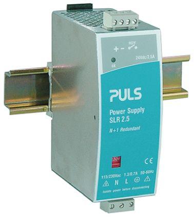This is Switch Mode DIN Rail Panel Mount Power Supply 60W 24V dc/ 2.5A manufactured by PULS. The manufacturer part number is SLR2.100. Additionally, the product is supplied with 1 outputs. Carries 30mv pk-pk ripple and noise. It has a/an dc output voltage . It carries 2.5a output current. The product is available in din rail mount configuration. The product has +70°c maximum temperature. While its minimum temperature is -10°c. Its electrical phase configuration includes 1. It has ac input voltage. In addition, the height is 124mm. Furthermore, the product is 49mm wide. The product comes in 102mm depth. The MTBF values include 700000h. Features a 24v dc output voltage. Feature 60w of power rating. It comes in switch mode configuration. Its input voltage is 100 → 120v ac.