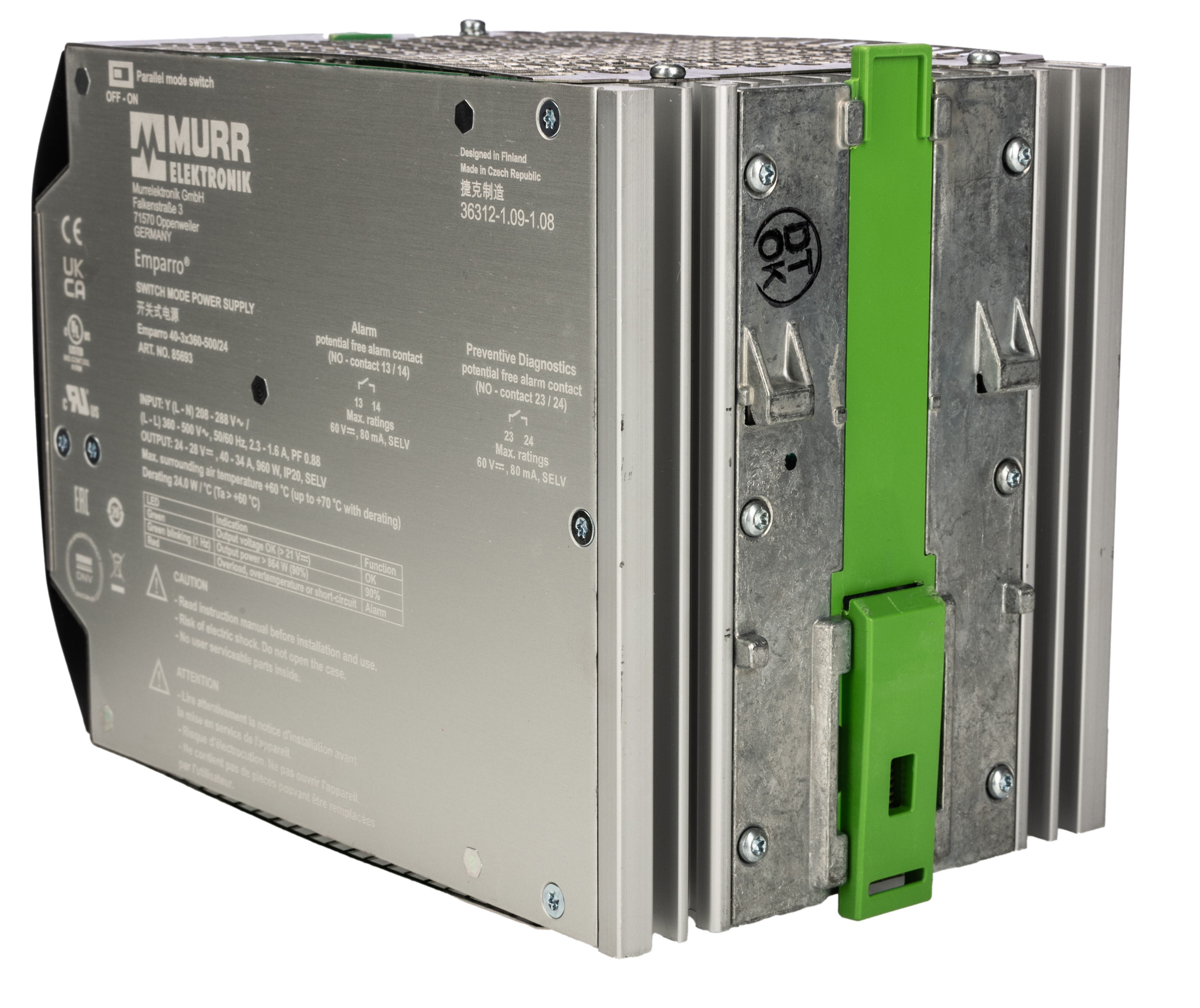 This is EMPARRO Switch Mode DIN Rail Power Supply 960W 24V dc/ 40A manufactured by Murrelektronik Limited. The manufacturer part number is 85693. Additionally, the product is supplied with 1 outputs. It has 24 → 28v of output voltage adjustment range. Carries 20mv ac ripple and noise. It carries 40a output current. The given dimensions of the product include 138 x 109 x 182mm. The product is available in din rail mount configuration. The product has +70°c maximum temperature. The product emparro, is a highly preferred choice for users. Its electrical phase configuration includes 2, 3. In addition, the height is 138mm. Furthermore, the product is 109mm wide. The product comes in 182mm depth. The MTBF values include >775000h. Features a 24v dc output voltage. While its minimum temperature is -40°c. It has a/an dc output voltage . The product also provides special features, such as optimum performance, reliable, space saving. It comes in switched mode configuration. Its input voltage is 400v ac. The product complies with all safety standards, such as culus, culus recognised, en 55011 b, en 60715, en 60950-1, en 61000-3-2, en 61204-3, semi f47.