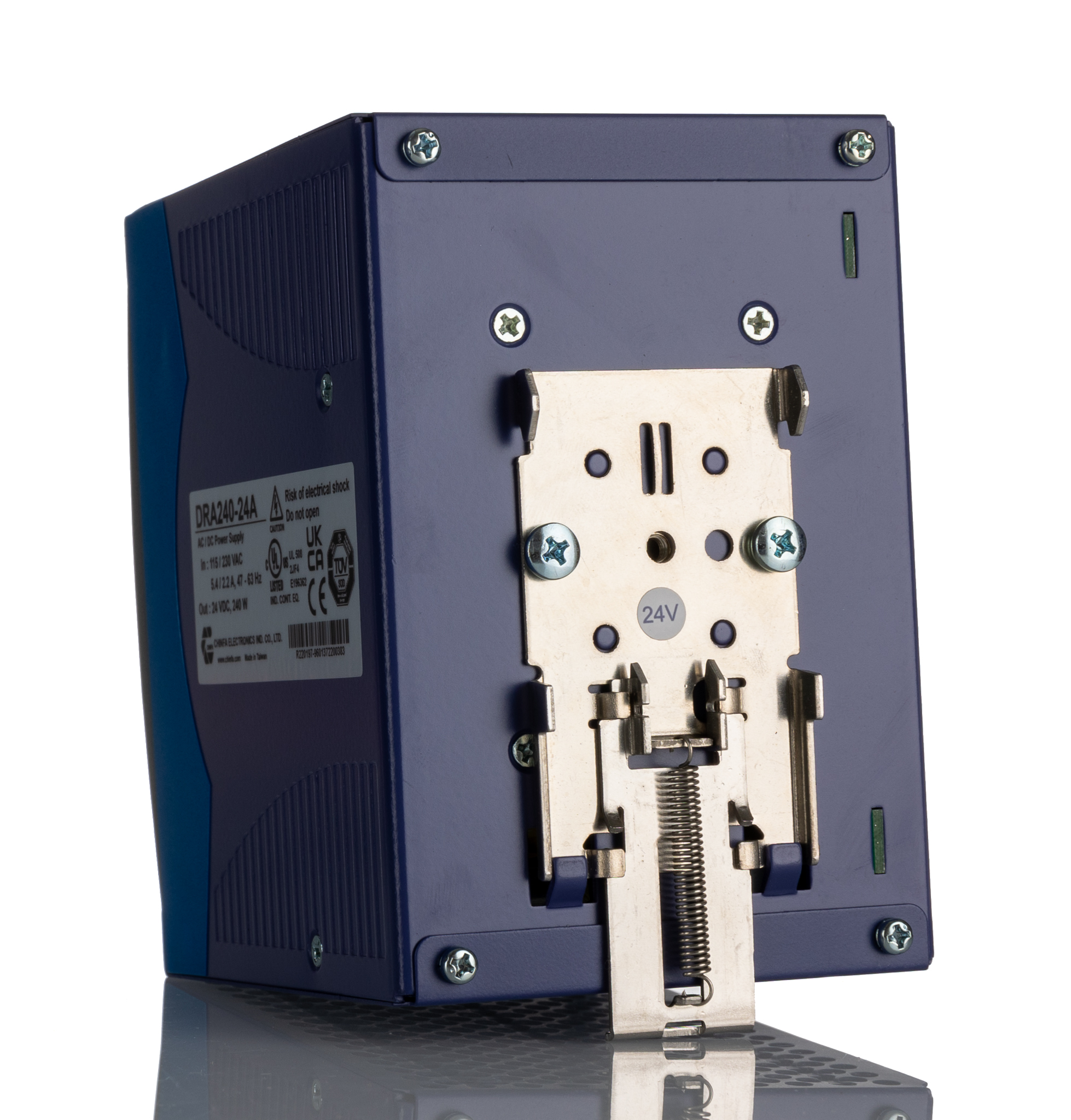 This is DRA240 DIN Rail Panel Mount Power Supply 240W 24V dc/ 10A manufactured by Chinfa. The manufacturer part number is DRA240-24A. Additionally, the product is supplied with 1 outputs. Load Regulation - ±1%. It carries 10a output current. The given dimensions of the product include 83.5 x 123.6 x 124.5mm. The product is available in din rail mount configuration. The product has +71°c maximum temperature. The product dra240, is a highly preferred choice for users. Its electrical phase configuration includes 1. It has ac input voltage. In addition, the height is 125mm. Furthermore, the product is 123.6mm wide. The product comes in 124mm depth. The MTBF values include 423000h. Features a 24v dc output voltage. While its minimum temperature is -40°c. It has a/an dc output voltage . Carries 100mv ripple and noise. It comes in switched mode configuration. Its input voltage is 90 → 264v ac. The product complies with all safety standards, such as en 55032, en 61558-1, en 61558-2-16, en 62368-1, ul 508, ul 62368-1.
