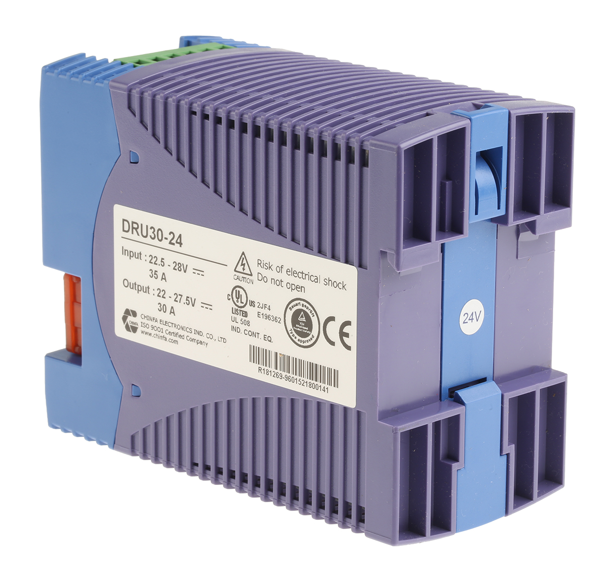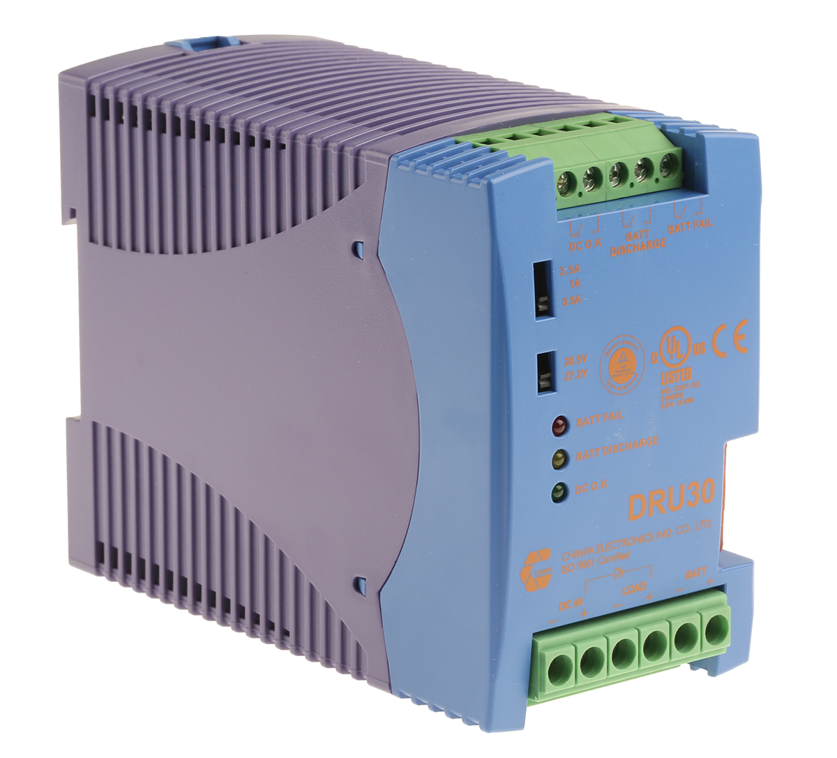 The DRU30-24 by Chinfa is a DIN-rail-mounted UPS (DC power supply with battery backup) designed for industrial control systems. It delivers a stable 24 V DC output at 30 A, combining power supply and battery charger functionality. With universal input (22.5–28 V DC) and features like reverse polarity protection, low-voltage disconnect, and built-in battery testing, it safeguards critical loads against power interruptions. Its compact rail-compatible form ensures seamless integration into control panels, automation racks, or instrumentation cabinets. Ideal for infrastructure requiring dependable, uninterrupted DC power.