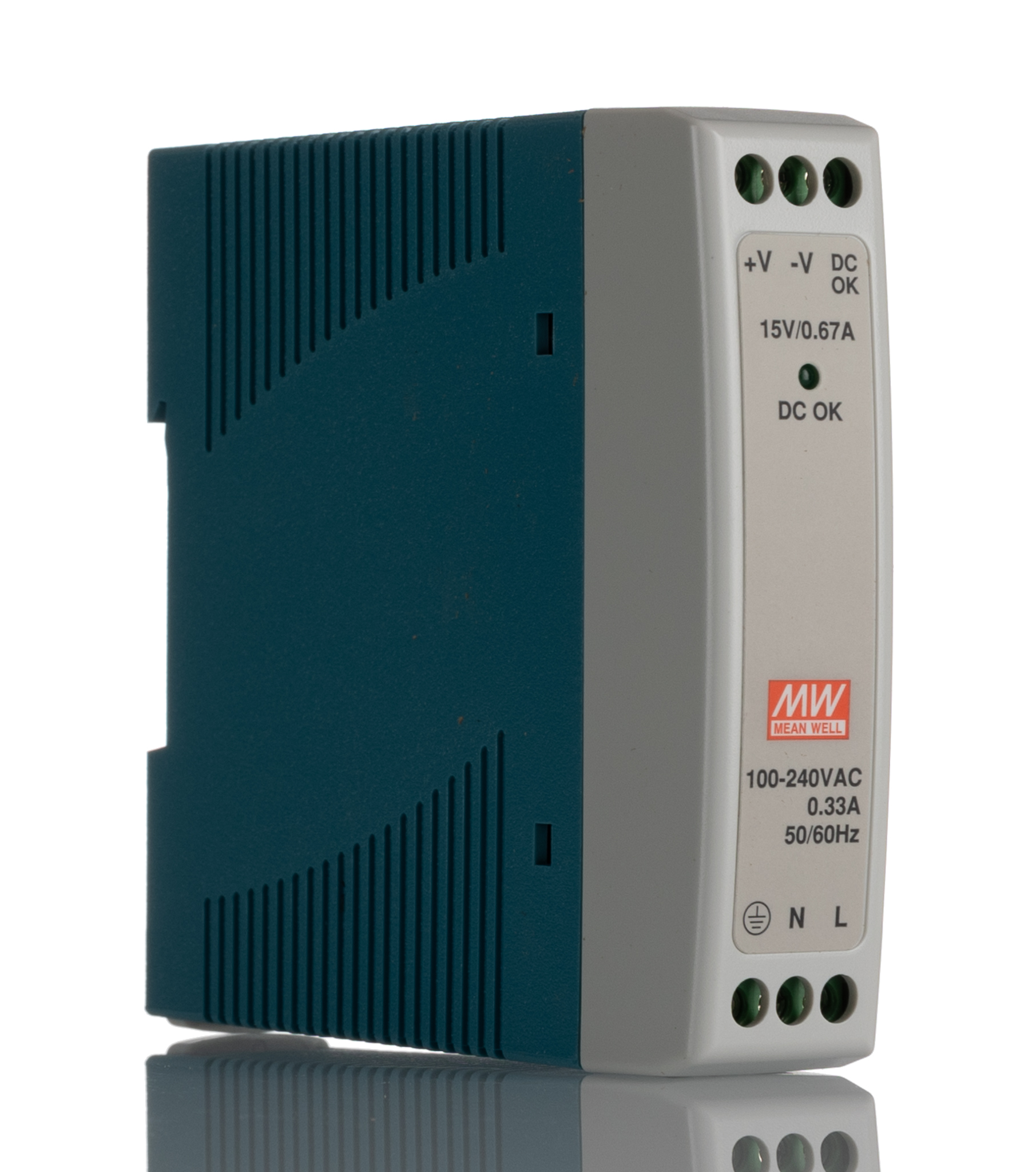 This is Switch Mode DIN Rail Panel Mount Power Supply 10W 15V dc/ 670mA manufactured by Mean Well. The manufacturer part number is MDR-10-15. The product has +70°c maximum temperature. It has a/an dc output voltage . The given dimensions of the product include 100 x 22.5 x 90mm. While its minimum temperature is -20°c. It has ac input voltage. Furthermore, the product is 22.5mm wide. The MTBF values include 584000h. Its electrical phase configuration includes 1. It comes in switched mode configuration. Load Regulation - ±3%. The product complies with all safety standards, such as rohs compliant, tuv en 60950-1, ul 508. Its input voltage is 85 → 264v ac. Additionally, the product is supplied with 1 outputs. It has 4.75 → 5.5v of output voltage adjustment range. Carries 120mv pk-pk ripple and noise. The product comes in 90mm depth. The product also provides special features, such as overvoltage and short circuit protection. The product is available in din rail mount configuration. It carries 670ma output current. The product mdr, is a highly preferred choice for users. In addition, the height is 100mm. Features a 15v dc output voltage.