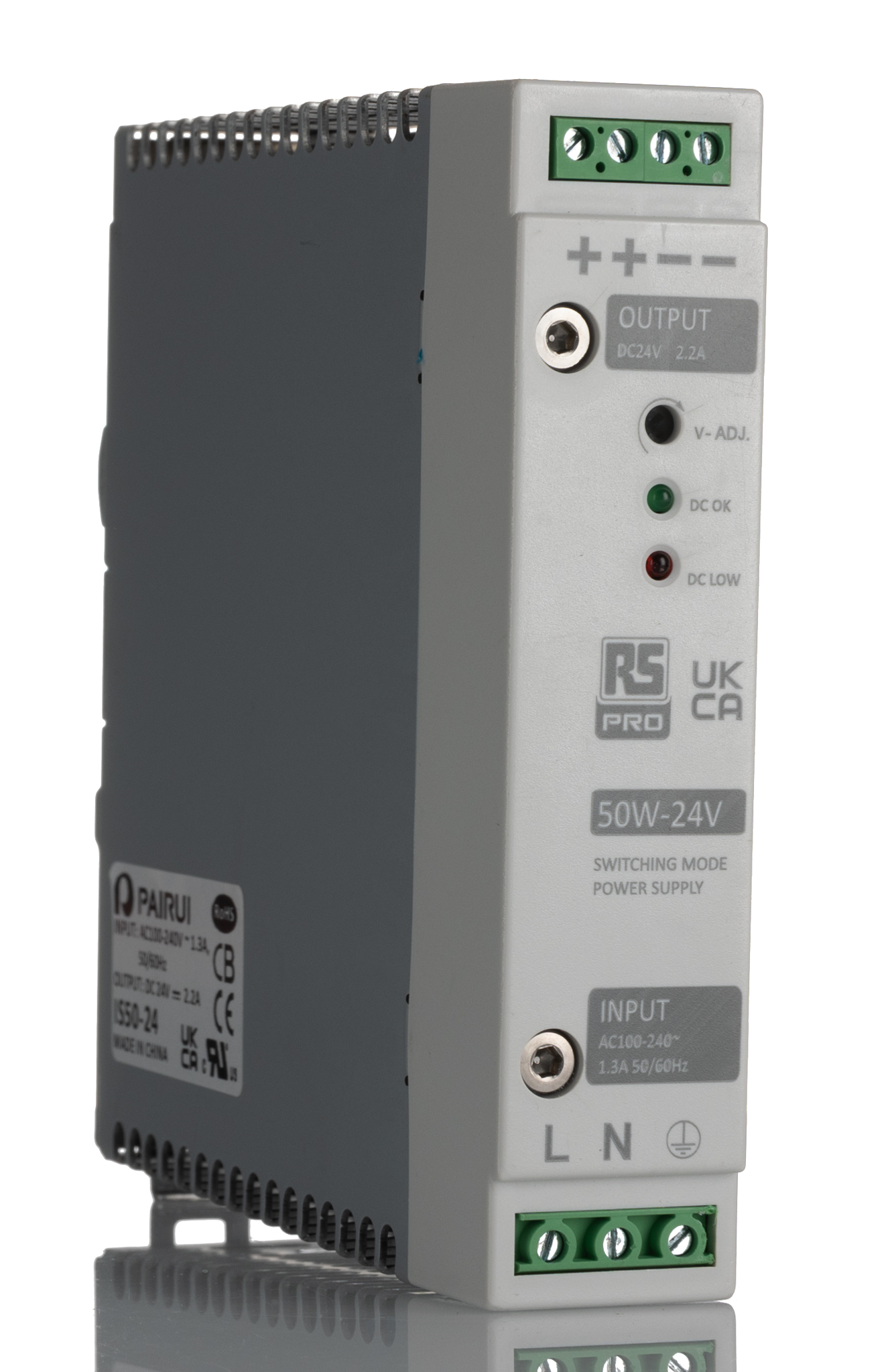 This is AC-DC Switching Power Supply DIN Rail Power Supply 50W 24V dc/ 2.2A manufactured by RS Pro. The manufacturer part number is 136-8310. Additionally, the product is supplied with 1 outputs. It has 23.5 → 24.5v of output voltage adjustment range. Load Regulation - 1%. It carries 2.2a output current. The given dimensions of the product include 30 x 130 x 125mm. The product is available in din rail mount configuration. The product has +70°c maximum temperature. While its minimum temperature is -25°c. Its electrical phase configuration includes 1. The product also provides special features, such as 100% full load burn-in test, 3-years warranty, compact size, cooling by free air convection, led indicator for dc low, led indicator for dc power on. In addition, the height is 130mm. Furthermore, the product is 30mm wide. The product comes in 125mm depth. The MTBF values include 200kh. Features a 24v dc output voltage. It has a/an dc output voltage . Carries 40mv ripple and noise. It comes in switched mode configuration. Its input voltage is 230v ac. The product complies with all safety standards, such as cb, ce, cul, culus recognised, fcc, ul.