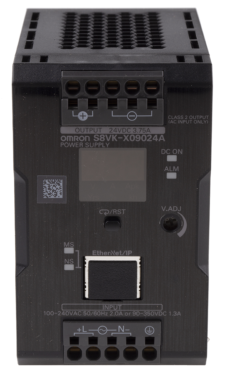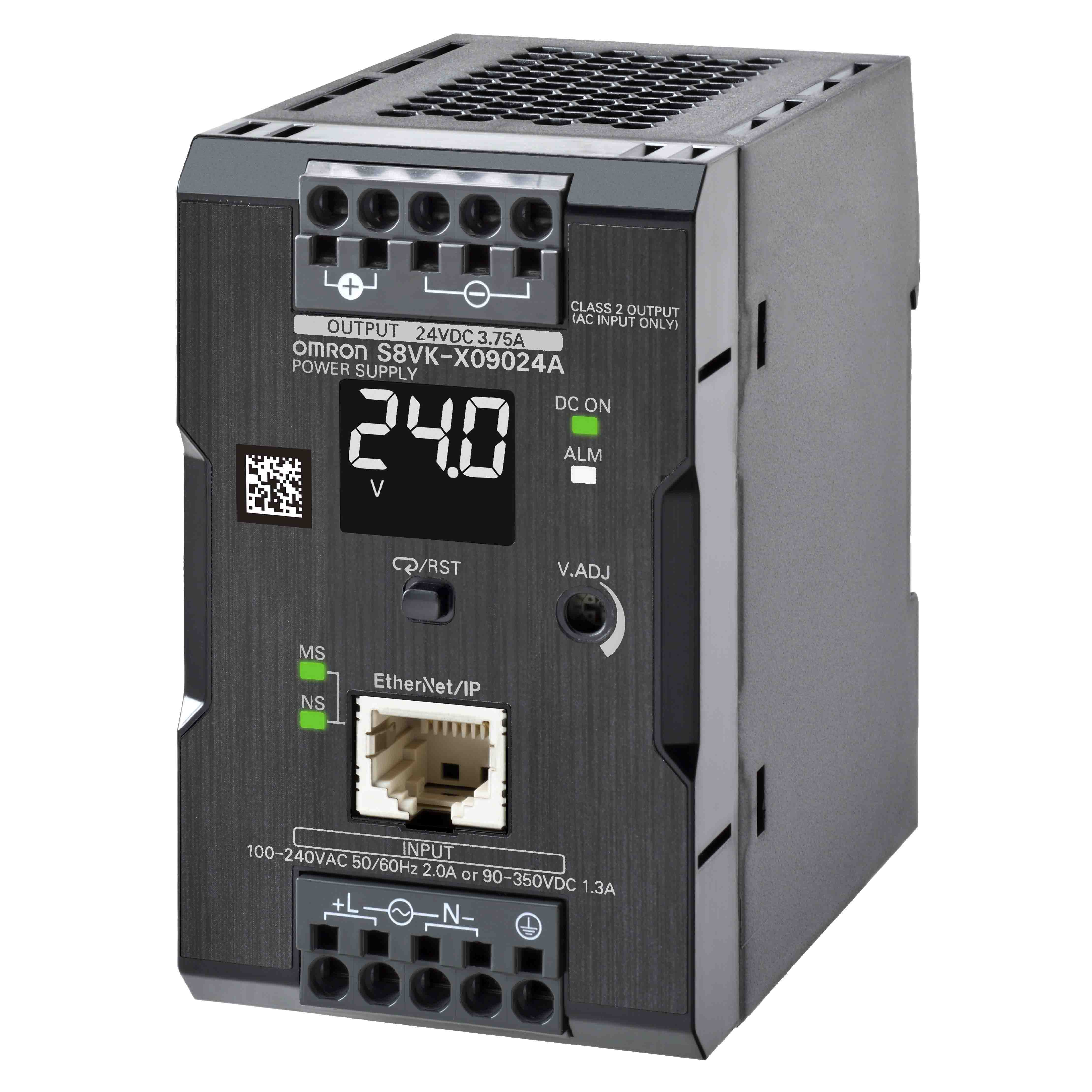 This is S8VK-X Switched Mode Power Supply DIN Rail Panel Mount Power Supply 90W 24V dc/ 3.75A manufactured by Omron. The manufacturer part number is S8VK-X09024A-EIP. The product has +70°c maximum temperature. It has a/an dc output voltage . The given dimensions of the product include 55 x 92.3 x 90mm. While its minimum temperature is -40°c. It has ac input voltage. Furthermore, the product is 55mm wide. The MTBF values include 110000h. Its electrical phase configuration includes 1. It comes in switched mode configuration. Load Regulation - 1.5%. The product complies with all safety standards, such as ce, culus, eac, en 61000-3-2, en 61204-3, en/iec 60529, en/iec 61558-2-16, tuv, ul. It is a highly efficient product with an 87% of high efficiency. Its input voltage is 100 → 240v ac. Additionally, the product is supplied with 1 outputs. It has 23 → 24.1v of output voltage adjustment range. Carries 300mv pk-pk ripple and noise. The product comes in 92mm depth. The product also provides special features, such as and more are acquired on the network and can be managed all at once, output current, output voltage, power boost function at 150%, replacement time, status can be checked on-site using the indication monitor. The product is available in din rail mount configuration. It carries 3.75a output current. The product s8vk-x, is a highly preferred choice for users. In addition, the height is 90mm. Features a 24v dc output voltage.