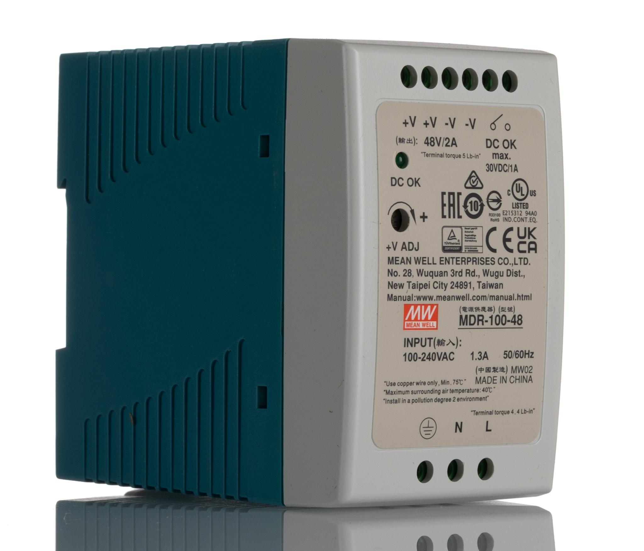 This is Switch Mode DIN Rail Panel Mount Power Supply 96W 48V dc/ 2A manufactured by Mean Well. The manufacturer part number is MDR-100-48. The product has +60°c maximum temperature. It has a/an dc output voltage . The given dimensions of the product include 100 x 55 x 90mm. While its minimum temperature is -10°c. It has ac input voltage. Furthermore, the product is 55mm wide. The MTBF values include 346kh. Its electrical phase configuration includes 1. It comes in switched mode configuration. Load Regulation - ±1%. The product complies with all safety standards, such as rohs compliant, tuv en 60950-1, ul 508. Its input voltage is 85 → 264v ac. Additionally, the product is supplied with 1 outputs. It has 48 → 56v of output voltage adjustment range. Carries 200mv pk-pk ripple and noise. The product comes in 90mm depth. The product also provides special features, such as overvoltage and short circuit protection. The product is available in din rail mount configuration. It carries 2a output current. The product mdr, is a highly preferred choice for users. In addition, the height is 100mm. Features a 48v dc output voltage.