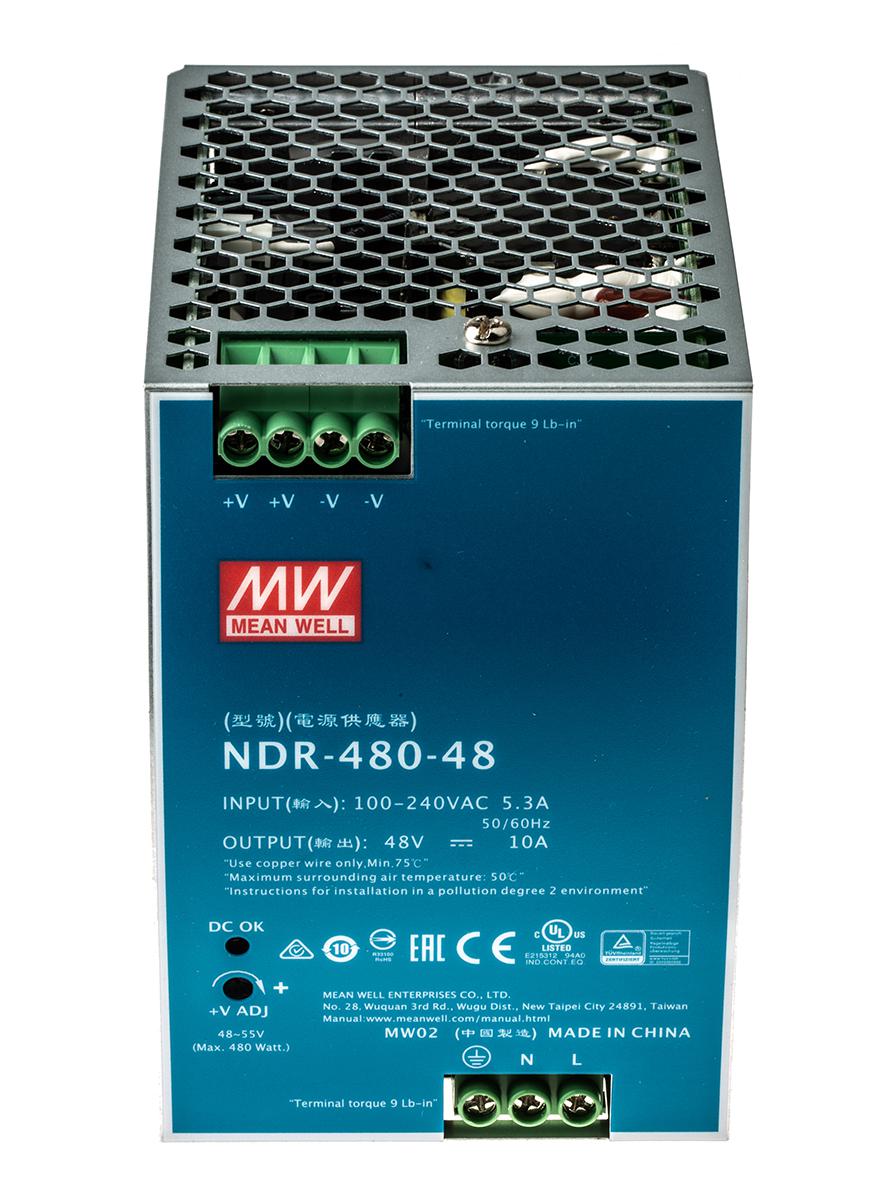 This is NDR-480 DIN Rail Power Supply 480W 48V dc/ 0 → 10A manufactured by Mean Well. The manufacturer part number is NDR-480-48. The product has +70°c maximum temperature. It has a/an dc output voltage . The given dimensions of the product include 125.2 x 85.5 x 128.5mm. While its minimum temperature is -20°c. It has ac input voltage. Furthermore, the product is 85.5mm wide. The MTBF values include 146.8kh. Its electrical phase configuration includes 1. It comes in switched mode configuration. Load Regulation - ±1%. The product complies with all safety standards, such as rohs compliant, tuv en 60950-1, ul 508. Its input voltage is 90 → 264v ac. Additionally, the product is supplied with 1 outputs. It has 48 → 55v of output voltage adjustment range. Carries 150mv pk-pk ripple and noise. The product comes in 129mm depth. The product also provides special features, such as overvoltage and short circuit protection. The product is available in din rail mount configuration. It carries 10a output current. The product ndr, is a highly preferred choice for users. In addition, the height is 125mm. Features a 48v dc output voltage. Feature 480w of power rating.