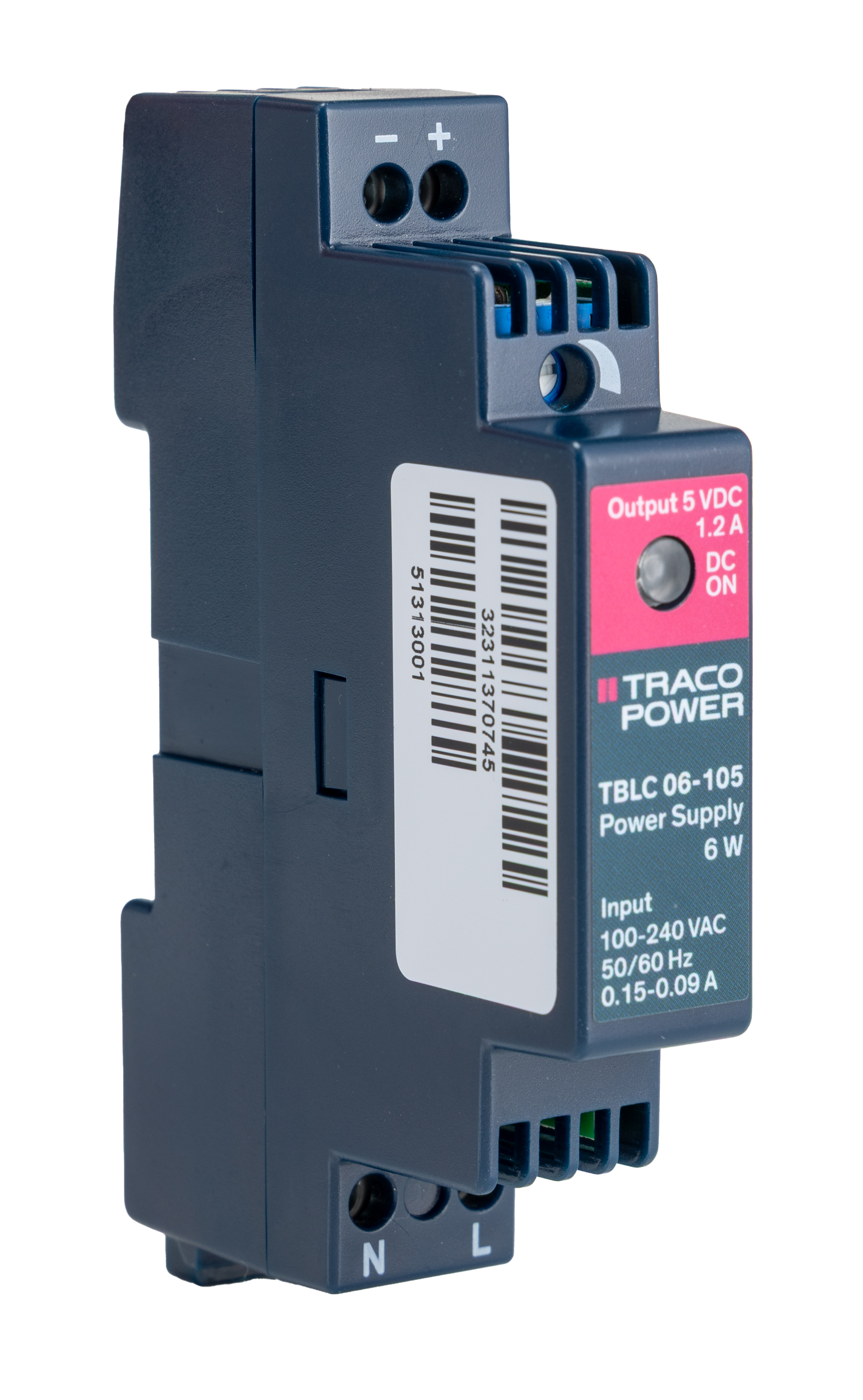 This is TBLC DIN Rail Power Supply 6W 1.2A manufactured by TRACOPOWER. The manufacturer part number is TBLC 06-105. The product has +70°c maximum temperature. It has a/an dc output voltage . The given dimensions of the product include 89.5 x 18 x 59.5mm. While its minimum temperature is -25°c. It has ac input voltage. Furthermore, the product is 18mm wide. The MTBF values include 1900kh. Its electrical phase configuration includes 1. It comes in switched mode configuration. Load Regulation - 0.3%. The product complies with all safety standards, such as erp compliant. It is a highly efficient product with an 74% of high efficiency. Its input voltage is 85 → 264v ac. Additionally, the product is supplied with 1 outputs. It has 5 → 5.5v of output voltage adjustment range. Carries 50mv pk-pk ripple and noise. The product comes in 89.5mm depth. The product also provides special features, such as adjustable output voltage, compliant to new standby power & efficiency requirements, low output ripples & spikes. The product is available in din rail mount configuration. It carries 1.2a output current. The product tblc 06, is a highly preferred choice for users. In addition, the height is 59.5mm. Features a 5v dc output voltage.