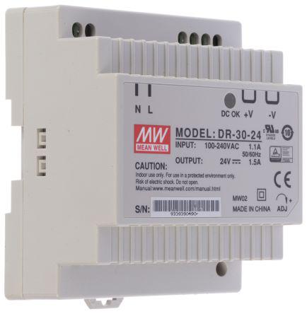 This is Switch Mode DIN Rail Panel Mount Power Supply 36W 24V dc/ 1.5A manufactured by Mean Well. The manufacturer part number is DR-30-24. The product has +60°c maximum temperature. It has a/an dc output voltage . While its minimum temperature is -20°c. It has ac input voltage. Furthermore, the product is 78mm wide. The MTBF values include 441.5kh. Its electrical phase configuration includes 1. It comes in switch mode configuration. Load Regulation - ±1%. The product complies with all safety standards, such as rohs compliant, tuv en 60950-1, ul 508. Its input voltage is 85 → 264v ac. Additionally, the product is supplied with 1 outputs. It has 21.6 → 26.4v of output voltage adjustment range. Carries 150mv pk-pk ripple and noise. The product comes in 56mm depth. The product also provides special features, such as overvoltage and short circuit protection. The product is available in din rail mount configuration. It carries 1.5a output current. The product dr, is a highly preferred choice for users. In addition, the height is 93mm. Features a 24v dc output voltage. Feature 30w of power rating.