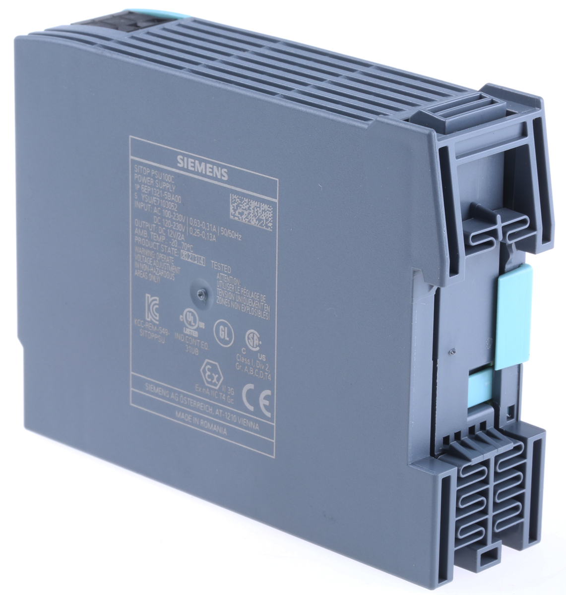 This is Switch Mode DIN Rail Panel Mount Power Supply 24W 12V dc/ 2A manufactured by Siemens. The manufacturer part number is 6EP1321-5BA00. The product has +70°c maximum temperature. It has a/an dc output voltage . The given dimensions of the product include 100 x 30 x 80mm. While its minimum temperature is -20°c. It has ac, dc input voltage. Furthermore, the product is 30mm wide. The MTBF values include 3737060h. Its electrical phase configuration includes 1. It comes in switched mode configuration. Load Regulation - 1%. The product complies with all safety standards, such as ce. It is a highly efficient product with an 82% of high efficiency. Its input voltage is 100 → 230 v ac / 110 → 300v dc. Additionally, the product is supplied with 1 outputs. It has 10.5 → 12.9v of output voltage adjustment range. Carries 200mv pk-pk ripple and noise. The product comes in 100mm depth. The product is available in din rail mount configuration. It carries 2a output current. The product sitop psu100c, is a highly preferred choice for users. In addition, the height is 80mm. Features a 12v dc output voltage.