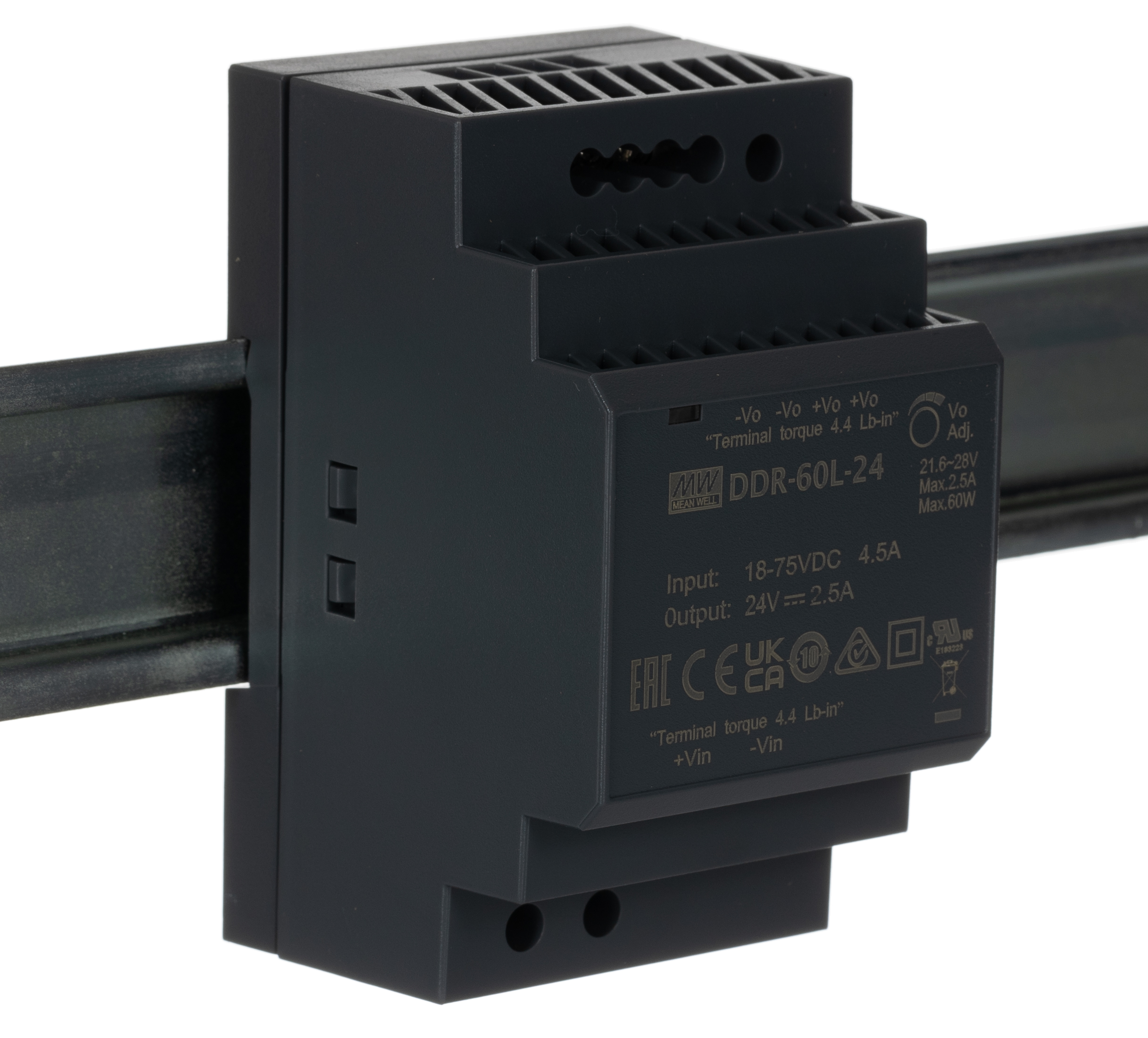 This is DIN Rail Power Supply 24V 60W manufactured by Mean Well. The manufacturer part number is DDR-60L-24. Additionally, the product is supplied with 1 outputs. It has 21.6 → 28v of output voltage adjustment range. Load Regulation - ±0.5%. It carries 2.5a output current. The product is available in din rail mount configuration. The product has +85°c maximum temperature. The product ddr-60, is a highly preferred choice for users. Furthermore, the product is 52.5mm wide. The product comes in 54.5mm depth. Features a 24v dc output voltage. While its minimum temperature is -40°c. Feature 60w of power rating.