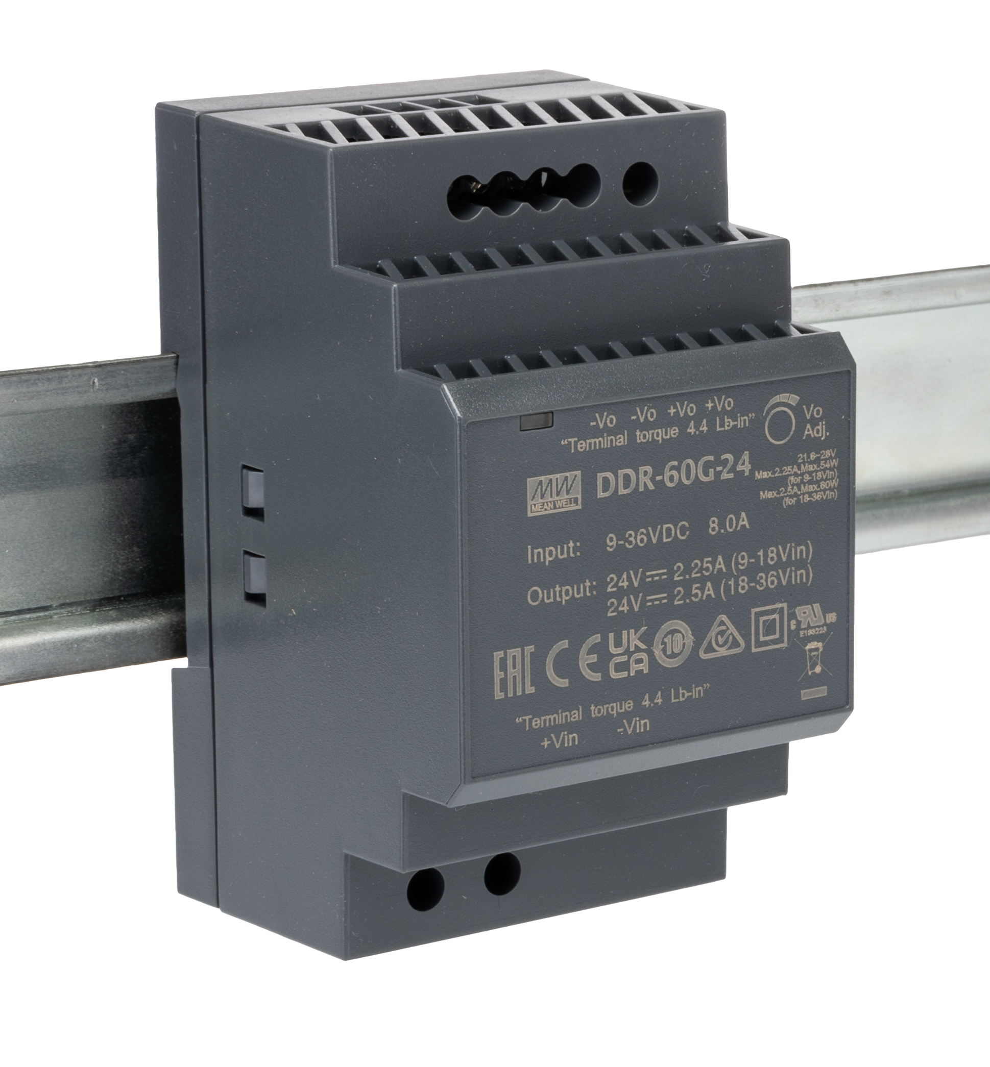 This is DIN Rail Power Supply 24V 60W manufactured by Mean Well. The manufacturer part number is DDR-60G-24. Additionally, the product is supplied with 1 outputs. It has 21.6 → 28v of output voltage adjustment range. Load Regulation - ±0.5%. It carries 2.5a output current. The product is available in din rail mount configuration. The product has +85°c maximum temperature. The product ddr-60, is a highly preferred choice for users. Furthermore, the product is 52.5mm wide. The product comes in 54.5mm depth. Features a 24v dc output voltage. While its minimum temperature is -40°c. Feature 60w of power rating.