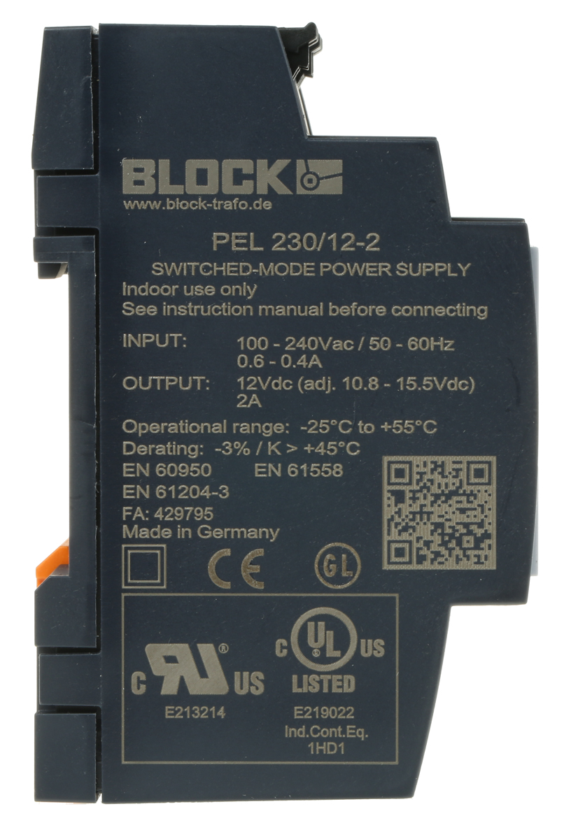 This is PEL 230 Switch Mode DIN Rail Panel Mount Power Supply 12V dc/ 2A manufactured by Block. The manufacturer part number is PEL 230/12-2. Additionally, the product is supplied with 1 outputs. It has 10.5 to 15.5v of output voltage adjustment range. Carries 100mv ripple and noise. It has a/an dc output voltage . The given dimensions of the product include 54 x 59 x 89mm. The product is available in din rail mount configuration. It is a highly efficient product with an 80.0% of high efficiency. The product has +85°c maximum temperature. The product pel 230, is a highly preferred choice for users. Its electrical phase configuration includes 1. It has ac, dc input voltage. In addition, the height is 89mm. Furthermore, the product is 59mm wide. The product comes in 89mm depth. Its input voltage is 85 → 264 v ac / 120 → 373v dc. Features a 12v dc output voltage. While its minimum temperature is -25°c. Feature 24w of power rating. It comes in switched mode configuration. It carries 2a output current.