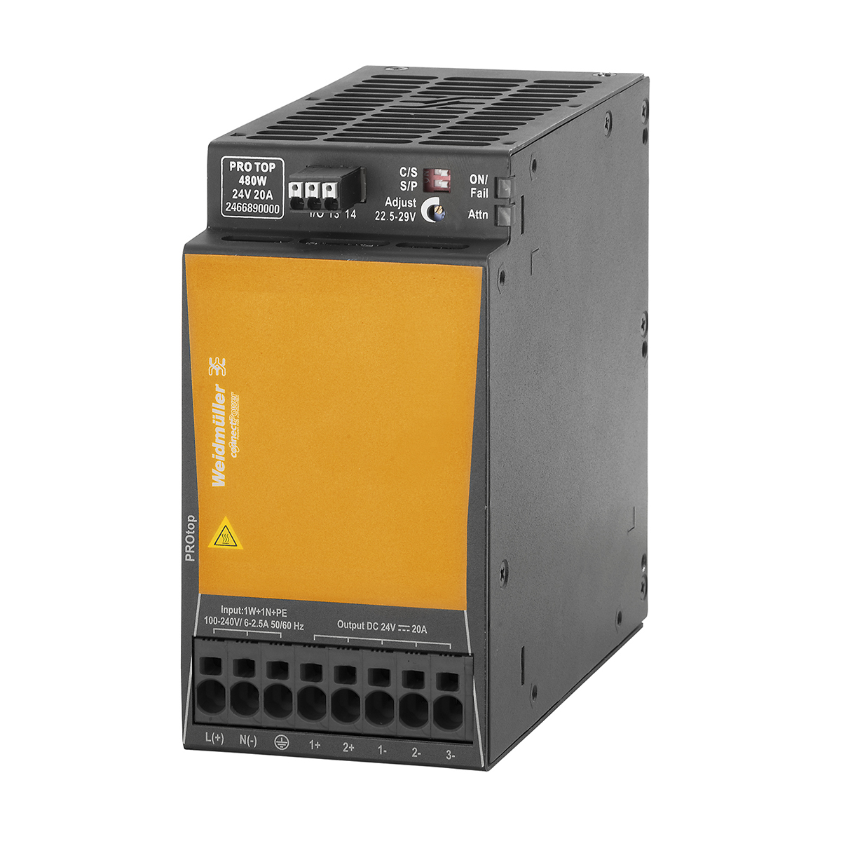 This is DIN Rail Power Supply 480W 24V 20A manufactured by Weidmuller. The manufacturer part number is 2466890000. Additionally, the product is supplied with 1 outputs. Carries 50mv pk-pk ripple and noise. It has a/an dc output voltage . It carries 20a output current. The product is available in din rail mount configuration. The product has +70°c maximum temperature. The product pro top, is a highly preferred choice for users. Its electrical phase configuration includes 1. The product also provides special features, such as series switching capability, switch-mode power supply. It has ac, dc input voltage. In addition, the height is 130mm. Furthermore, the product is 68mm wide. The product comes in 125mm depth. The MTBF values include 1000000h. Features a 24v dc output voltage. While its minimum temperature is -25°c. Feature 480w of power rating. It comes in switch mode configuration. Its input voltage is 85 → 277v ac. It has typical 16 weeks of manufacturer standard lead time. It features enclosed ac dc converter 1 output 24v 20a 85 ~ 277 vac, 80 ~ 410 vdc input. 4kv of isolation voltage. The product is available in din rail configuration. It is a highly efficient product with an 93% of high efficiency. The product pro top1 (480w), is a highly preferred choice for users. It has a 24v output voltage. Does it require minimum load? no. The product's diameters include 4.92" l x 2.68" w x 5.12" h (125.0mm x 68.0mm x 130.0mm). The product is widely employed in ite (commercial). The product features power and watts of 480w. The maximum product's output current is 20a. The possible product's input voltage is 85 ~ 277 vac, 80 ~ 410 vdc. The product has -25°c ~ 70°c (with derating) operating temperature range. It comes in enclosed configuration. The weidmuller's product offers user-desired applications.