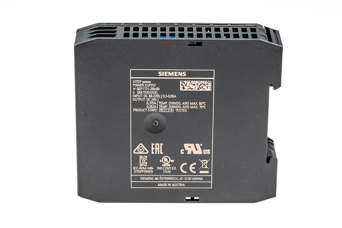 This is SITOP POWER Switch Mode DIN Rail Panel Mount Power Supply 9W 24V dc/ 375mA manufactured by Siemens. The manufacturer part number is 6EP1731-2BA00. Additionally, the product is supplied with 1 outputs. Load Regulation - 0.1%. It has a/an dc output voltage . The given dimensions of the product include 91 x 22.5 x 80mm. The product is available in din rail mount configuration. The product has +70°c maximum temperature. The product sitop power, is a highly preferred choice for users. Its electrical phase configuration includes 1. It has ac, dc input voltage. In addition, the height is 80mm. Furthermore, the product is 22.5mm wide. The product comes in 91mm depth. Its input voltage is 30 → 187v ac. Features a 24v dc output voltage. While its minimum temperature is -25°c. Feature 9w of power rating. Carries 150mv pk-pk ripple and noise. It comes in switched mode configuration. It carries 370ma output current.