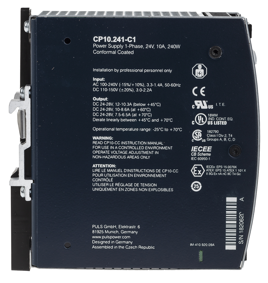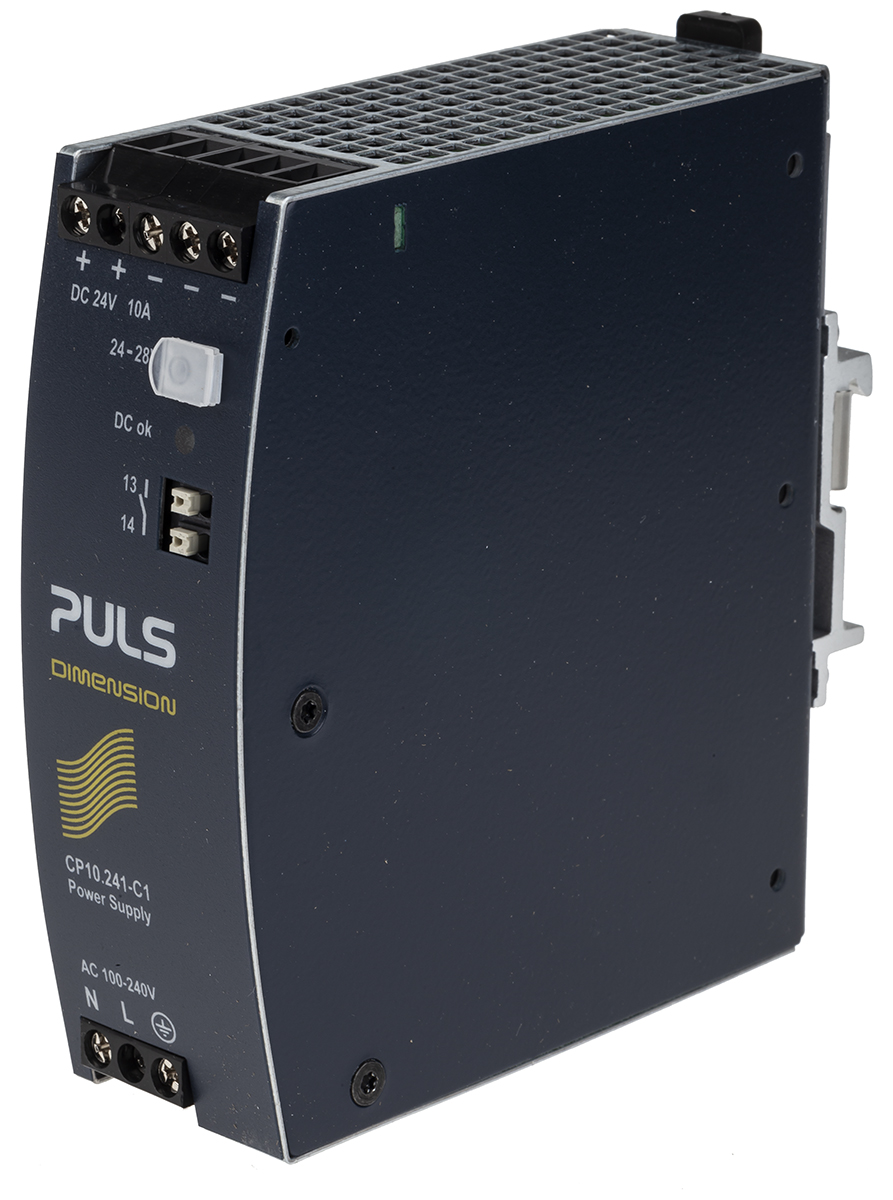 This is DIN Rail Power Supply 24V 10A 240W manufactured by PULS. The manufacturer part number is CP10.241-C1. The product has +70°c maximum temperature. It has a/an dc output voltage . The given dimensions of the product include 39 x 117 x 124mm. While its minimum temperature is -25°c. It has ac input voltage. Furthermore, the product is 39mm wide. The MTBF values include 100h. Its electrical phase configuration includes 1. Load Regulation - 50mv. The product complies with all safety standards, such as ansi/isa 12.12.01-2015, atex en 60079-0, atex en 60079-15, ce certified, cruus ul 60950-1, csaus certified, culus listed, gl listed, iecee iec 60950-1, iecex iec 60079-0, iecex iec 60079-15, ul 508. It is a highly efficient product with an 95.2% of high efficiency. Its input voltage is 100 → 240v ac. Additionally, the product is supplied with 1 outputs. It has 24 → 28v of output voltage adjustment range. Carries 50mv pk-pk ripple and noise. The product is certified with atex, iecex hazardous area certification. The product comes in 117mm depth. The product also provides special features, such as easy fuse breaking due to high overload peak current. The product is available in din rail mount configuration. It carries 10a output current. The product cp, is a highly preferred choice for users. In addition, the height is 124mm. Features a 24v dc output voltage.