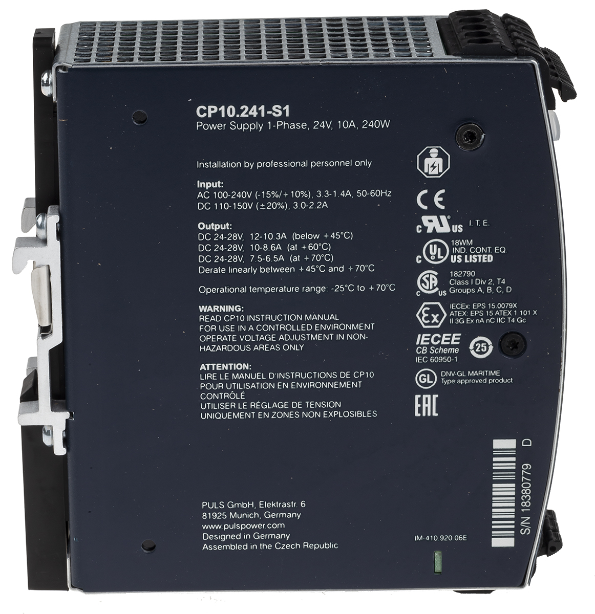 This is DIN Rail Power Supply 24V 10A 240W manufactured by PULS. The manufacturer part number is CP10.241-S1. The product has +70°c maximum temperature. It has a/an dc output voltage . The given dimensions of the product include 39 x 117 x 124mm. While its minimum temperature is -25°c. It has ac input voltage. Furthermore, the product is 39mm wide. The MTBF values include 100h. Its electrical phase configuration includes 1. Load Regulation - 50mv. The product complies with all safety standards, such as ansi/isa 12.12.01-2015, atex en 60079-0, atex en 60079-15, ce certified, cruus ul 60950-1, csaus certified, culus listed, gl listed, iecee iec 60950-1, iecex iec 60079-0, iecex iec 60079-15, ul 508. It is a highly efficient product with an 95.2% of high efficiency. Its input voltage is 100 → 240v ac. Additionally, the product is supplied with 1 outputs. It has 24 → 28v of output voltage adjustment range. Carries 50mv pk-pk ripple and noise. The product is certified with atex, iecex hazardous area certification. The product comes in 117mm depth. The product also provides special features, such as easy fuse breaking due to high overload peak current. The product is available in din rail mount configuration. It carries 10a output current. The product cp, is a highly preferred choice for users. In addition, the height is 124mm. Features a 24v dc output voltage.