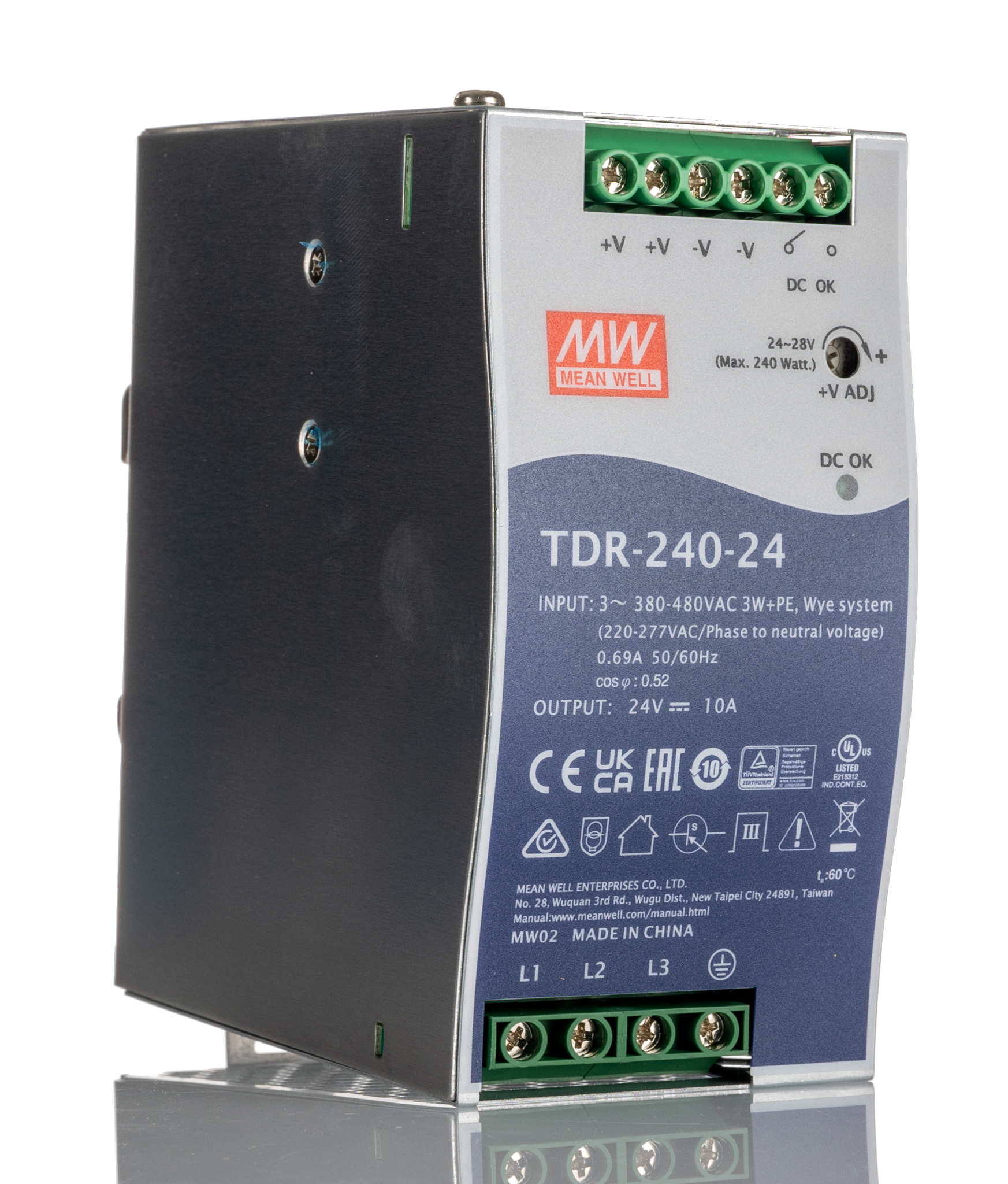 This is DIN Rail Power Supply 24V dc Output Voltage 10A output current manufactured by Mean Well. The manufacturer part number is TDR-240-24. The product has +70°c maximum temperature. It has a/an dc output voltage . The given dimensions of the product include 63 x 113.5 x 125.2mm. While its minimum temperature is -30°c. It has ac, dc input voltage. Furthermore, the product is 63mm wide. The MTBF values include 515.4kh. Its electrical phase configuration includes 3. It comes in switched mode configuration. Load Regulation - ±1%. The product complies with all safety standards, such as ce certified, en 61558, en61000-3-2, en61000-3-3, en61000-4-11, en61000-4-2, en61000-4-3, en61000-4-4, en61000-4-5, en61000-4-6, en61000-4-8, en61204-3, ul listed. It is a highly efficient product with an 92% of high efficiency. Its input voltage is 340 → 550 v ac / 480 → 780v dc. Additionally, the product is supplied with 1 outputs. It has 24 → 28v of output voltage adjustment range. Carries 100mv pk-pk ripple and noise. The product comes in 114mm depth. The product also provides special features, such as 3 year warranty, 63 mm slim width, cooling by free air convection. The product is available in din rail mount configuration. It carries 10a output current. The product tdr, is a highly preferred choice for users. In addition, the height is 125mm. Features a 24v dc output voltage.
