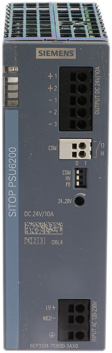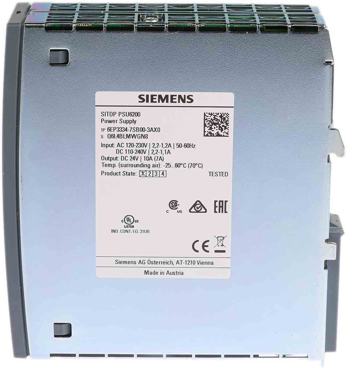 This is DIN Rail Power Supply 24V 10A 240W manufactured by Siemens. The manufacturer part number is 6EP3334-7SB00-3AX0. The product has +70°c maximum temperature. It has a/an dc output voltage . The given dimensions of the product include 45 x 125 x 135mm. While its minimum temperature is -25°c. It has ac, dc input voltage. Furthermore, the product is 45mm wide. Its electrical phase configuration includes 1. It comes in switched mode configuration. The product complies with all safety standards, such as ccsaus (csa c22.2 no. 60950-1, ul 60950-1), ce certified, culus-listed (ul 508, csa c22.2 no. 107.1), file e197259, en 55022 class b, en 61000-3-2, en 61000-6-2. It is a highly efficient product with an 92.8% of high efficiency. Its input voltage is 120 → 230 v ac / 120 → 240v dc. Additionally, the product is supplied with 1 outputs. It has 24 → 28v of output voltage adjustment range. Carries 30mv ripple and noise. The product comes in 125mm depth. The product also provides special features, such as led display. Is it a better world product? yes. It carries 10a output current. The product is available in din rail mount configuration. The product sitop psu6200, is a highly preferred choice for users. In addition, the height is 135mm. Features a 24v dc output voltage.