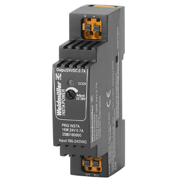 This is manufactured by Weidmüller. The manufacturer part number is 2580180000. It has 22 → 28v of output voltage adjustment range. The product has +70°c maximum temperature. It carries 700ma output current. The product complies with all safety standards, such as reach. The product is available in din rail mount configuration. It is a highly efficient product with an 82.5% of high efficiency. The product pro insta, is a highly preferred choice for users. Its electrical phase configuration includes 1. It has ac, dc input voltage. In addition, the height is 90.5mm. Furthermore, the product is 22.5mm wide. The product comes in 60mm depth. The MTBF values include 750000h. Features a 24v dc output voltage. While its minimum temperature is -25°c. It has a/an dc output voltage . Feature 16w of power rating. It comes in switched mode configuration. Its input voltage is 120 → 240 v ac / 120 → 340v dc. It has typical 16 weeks of manufacturer standard lead time. The product's diameters include 2.36" l x 0.89" w x 3.56" h (60.0mm x 22.5mm x 90.5mm). It features enclosed ac dc converters 1 output 24v 700ma 85 ~ 264 vac, 95 ~ 370 vdc input. 4kv of isolation voltage. The splendid features of the product include adjustable output, ip20, universal input. The product is available in din rail configuration. The product is widely employed in ite (commercial). The product connect power insta (16w), is a highly preferred choice for users. It has a 24v output voltage. In addition, box is the available packaging type of the product. The product features power and watts of 17w. The maximum product's output current is 700ma. It is approved by ccsaus, tuv. The possible product's input voltage is 85 ~ 264 vac, 95 ~ 370 vdc. The product has -25°c ~ 70°c (with derating) operating temperature range. It comes in enclosed configuration. Additionally, the product is supplied with 1 outputs. The weidmüller's product offers user-desired applications.