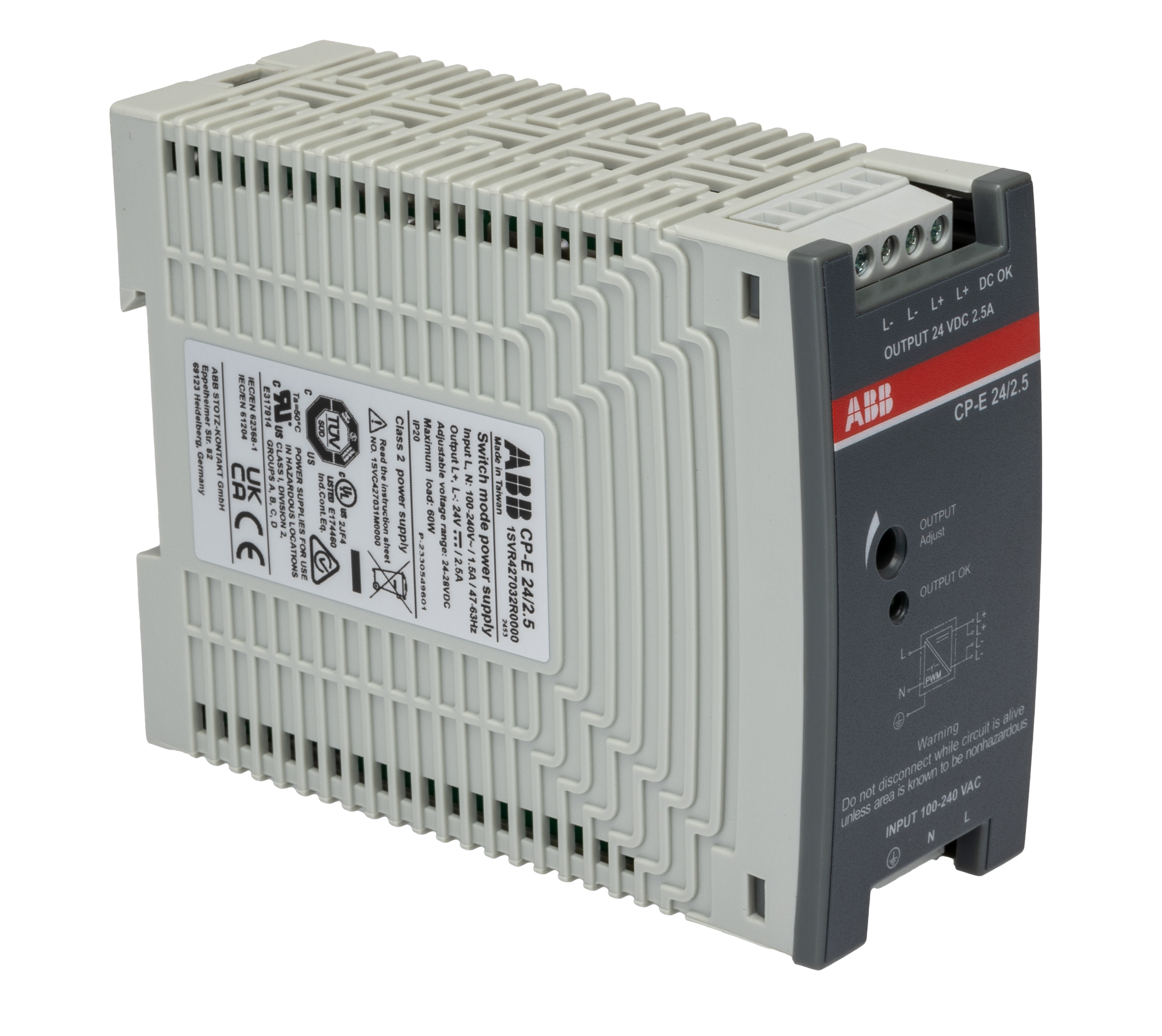 This is CP-E Switch Mode DIN Rail Power Supply 85 → 264V ac Input 24V dc Output 2.5A 60W manufactured by ABB. The manufacturer part number is 1SVR427032R0000 CP-E 24/2.5. Additionally, the product is supplied with 1 outputs. It has 24 → 28v of output voltage adjustment range. Load Regulation - ±0.5%. It has a/an dc output voltage . The given dimensions of the product include 115 x 43.5 x 88.5mm. The product is available in din rail mount configuration. It is a highly efficient product with an 89.0% of high efficiency. The product has +70°c maximum temperature. The product cp-e, is a highly preferred choice for users. Its electrical phase configuration includes 1. It has ac, dc input voltage. In addition, the height is 88.5mm. Furthermore, the product is 40.5mm wide. The product comes in 115mm depth. Its input voltage is 85 → 264 v ac / 90 → 375v dc. Features a 24v dc output voltage. While its minimum temperature is -40°c. Carries 50mv pk-pk ripple and noise. It comes in switched mode configuration. It carries 2.5a output current.