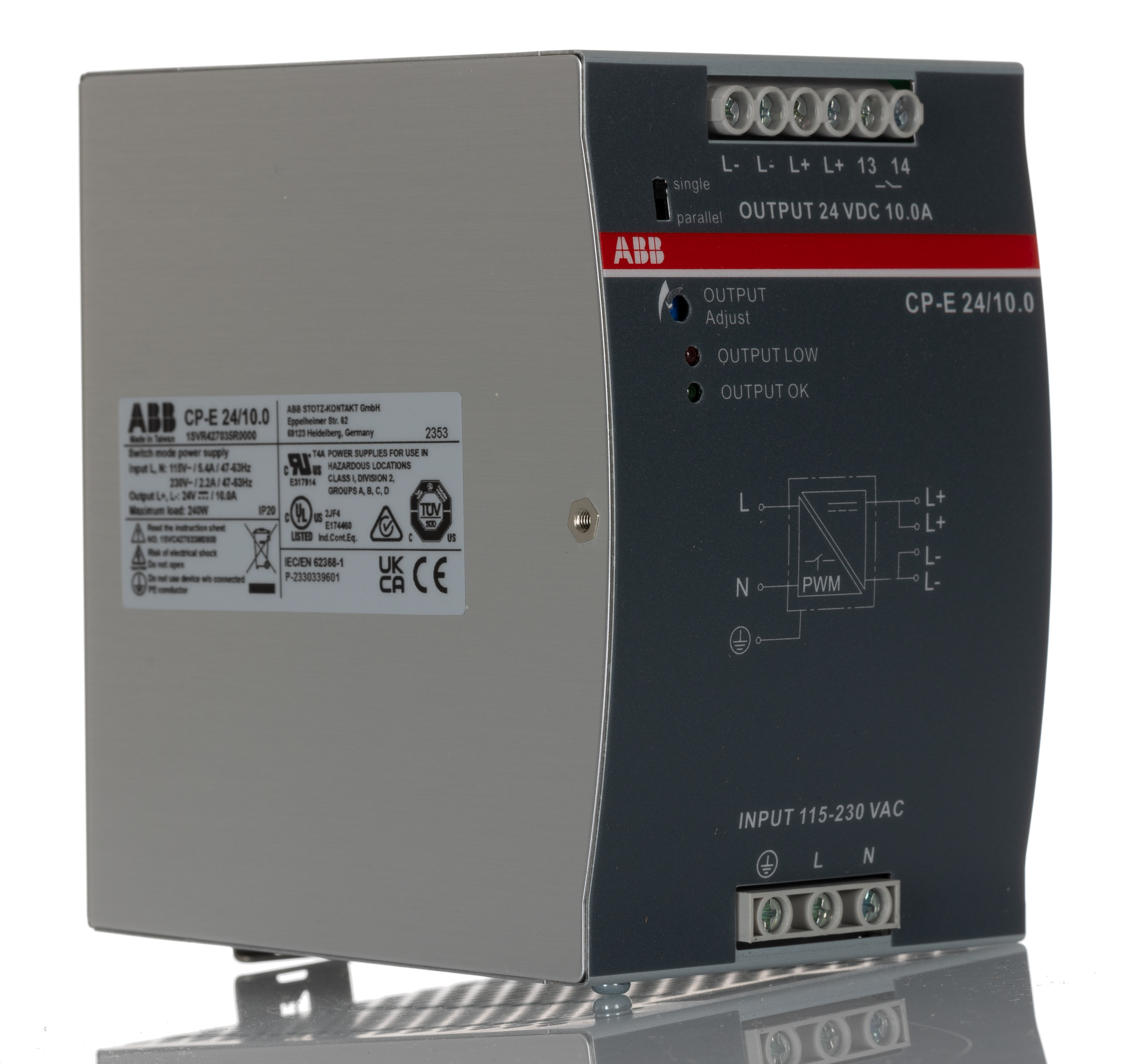 This is CP-E Switch Mode DIN Rail Power Supply 90 → 132V ac Input 24V dc Output 10A 240W manufactured by ABB. The manufacturer part number is 1SVR427035R0000 CP-E 24/10.0. Additionally, the product is supplied with 1 outputs. It has 22.5 to 28.5v of output voltage adjustment range. Carries 100mv ripple and noise. It has a/an dc output voltage . The given dimensions of the product include 123.6 x 83 x 123.6mm. The product is available in din rail mount configuration. It is a highly efficient product with an 89.0% of high efficiency. The product has +70°c maximum temperature. The product cp-e, is a highly preferred choice for users. Its electrical phase configuration includes 1. It has ac, dc input voltage. In addition, the height is 123.6mm. Furthermore, the product is 83mm wide. The product comes in 123.6mm depth. Its input voltage is 90 → 132 v ac,186 → 264 v ac / 210 → 370v dc. Features a 24v dc output voltage. While its minimum temperature is -40°c. It comes in switched mode configuration. It carries 10a output current. The product complies with all safety standards, such as ul 60950-1.