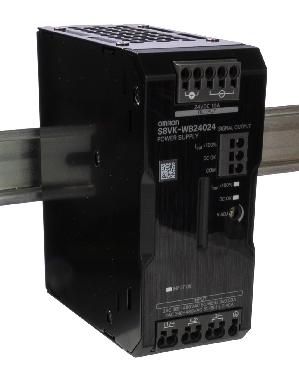 This is S8VK-WA DIN Rail Power Supply 400V Input 24V Output 10A manufactured by Omron. The manufacturer part number is S8VK-WB24024. Carries 50mv pk-pk ripple and noise. It carries 10a output current. The given dimensions of the product include 124 x 121.4 x 108.2mm. The product is available in din rail mount configuration. It is a highly efficient product with an 93% of high efficiency. The product has +70°c maximum temperature. The product s8vk-wa, is a highly preferred choice for users. Its electrical phase configuration includes 3. Additionally, the DC Input Voltage of the product is 810v dc In addition, the height is 124mm. Furthermore, the product is 55mm wide. The product comes in 112mm depth. The MTBF values include 290000h. It has ac input voltage. Features a 24v dc output voltage. While its minimum temperature is -40°c. It has a/an dc output voltage . It comes in switched mode configuration. Its input voltage is 380 → 400v ac. The product complies with all safety standards, such as ce.