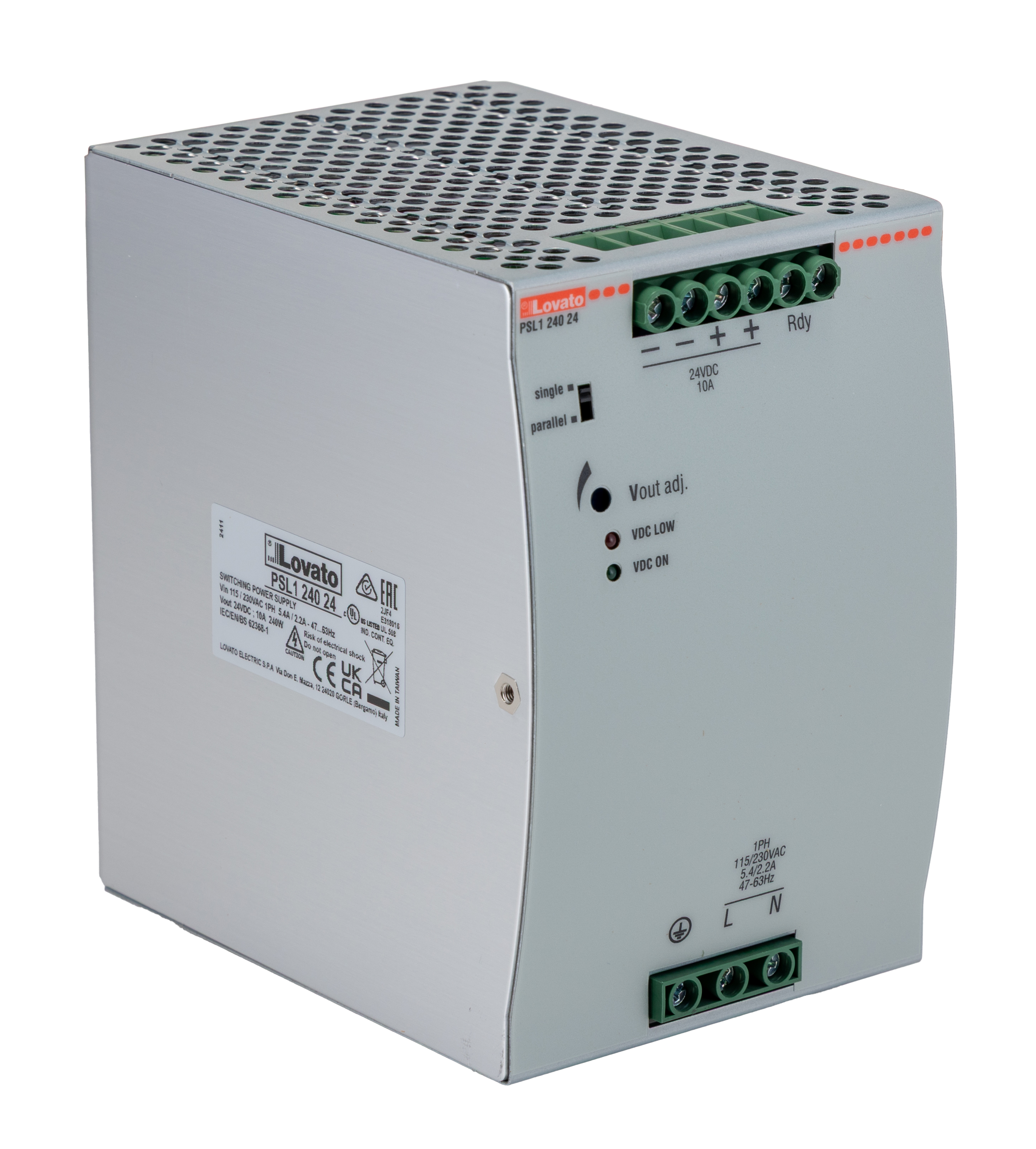 This is PSL DIN Rail Power Supply 230V ac ac Input 24V dc Output 10A Output manufactured by Lovato. The manufacturer part number is PSL124024. Carries 100mv ripple and noise. It has a/an dc output voltage . The given dimensions of the product include 83.5 x 124.5 x 123.6mm. The product is available in din rail mount configuration. The product has '+71°c maximum temperature. The product psl, is a highly preferred choice for users. Its electrical phase configuration includes 1. It has ac input voltage. In addition, the height is 124.5mm. Furthermore, the product is 83.5mm wide. The product comes in 123.6mm depth. Its input voltage is 230v ac. Features a 24v dc output voltage. While its minimum temperature is -40°c. It comes in switched mode configuration. It carries 10a output current. The product complies with all safety standards, such as iec/en 62368-1.