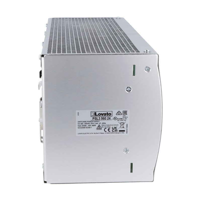 This is PSL DIN Rail Power Supply 500V ac ac Input 24V dc Output 40A Output manufactured by Lovato. The manufacturer part number is PSL396024. Carries 80mv ripple and noise. It has a/an dc output voltage . The given dimensions of the product include 275.8 x 125.9 x 120.3mm. The product is available in din rail mount configuration. It is a highly efficient product with an 92% of high efficiency. The product has '+71°c maximum temperature. The product psl, is a highly preferred choice for users. Its electrical phase configuration includes 3. It has ac input voltage. In addition, the height is 125.9mm. Furthermore, the product is 275.8mm wide. The product comes in 120.3mm depth. Its input voltage is 500v ac. Features a 24v dc output voltage. While its minimum temperature is -40°c. It comes in switched mode configuration. It carries 40a output current. The product complies with all safety standards, such as iec/en 62368-1.
