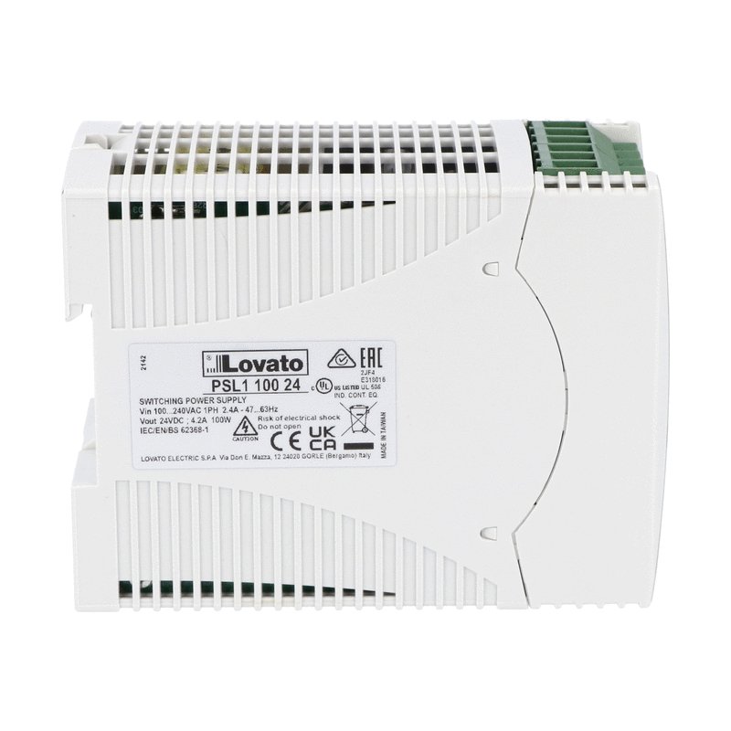 This is PSL DIN Rail Power Supply 240V ac ac Input 24V dc Output 4.2A Output manufactured by Lovato. The manufacturer part number is PSL110024. Carries 50mv ripple and noise. It has a/an dc output voltage . The given dimensions of the product include 54 x 90 x 115mm. The product is available in din rail mount configuration. The product has '+71°c maximum temperature. The product psl, is a highly preferred choice for users. Its electrical phase configuration includes 1. It has ac input voltage. In addition, the height is 90mm. Furthermore, the product is 54mm wide. The product comes in 115mm depth. Its input voltage is 240v ac. Features a 24v dc output voltage. While its minimum temperature is -35°c. It comes in switched mode configuration. It carries 4.2a output current. The product complies with all safety standards, such as iec/en 62368-1.