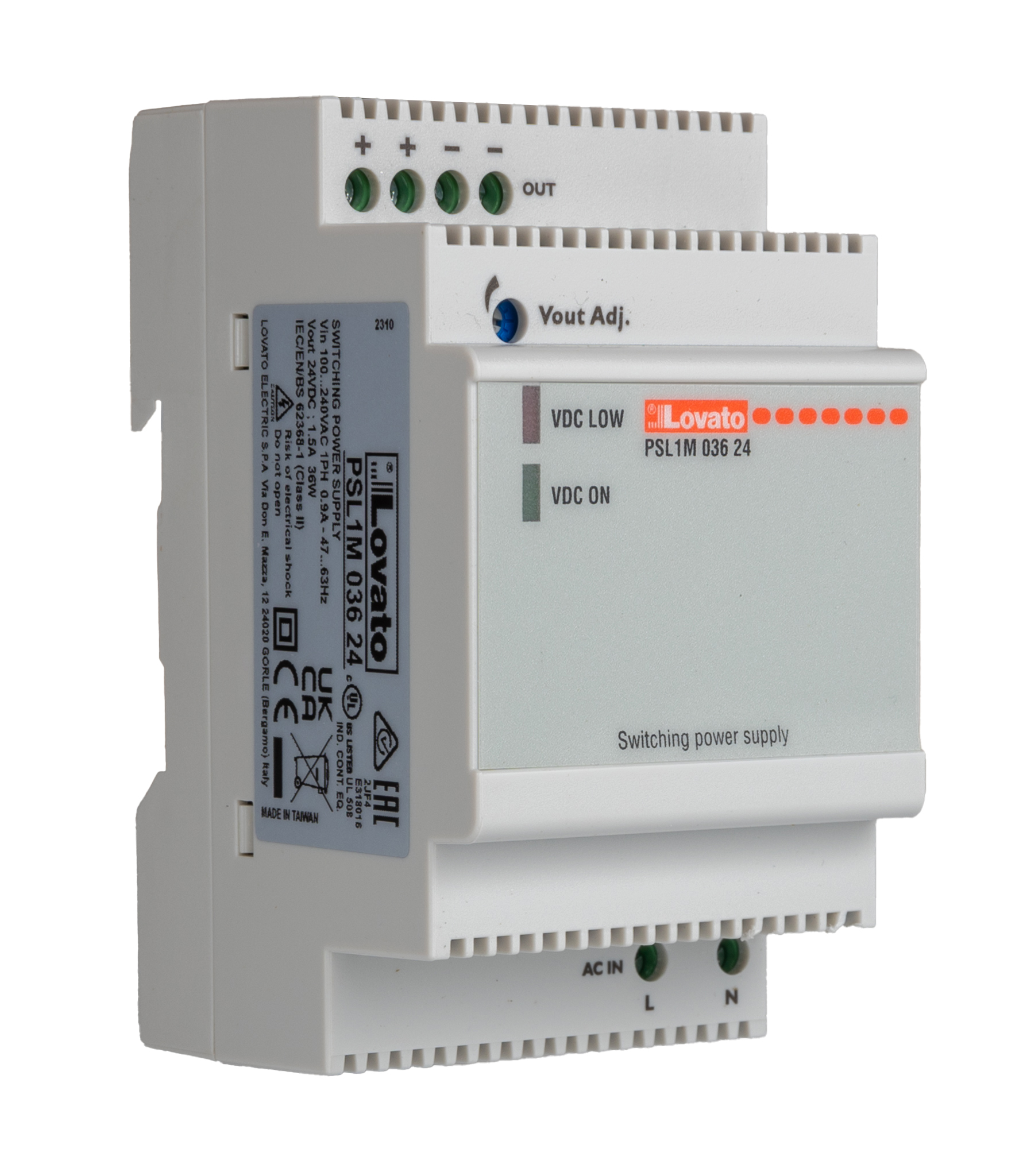 This is PSL DIN Rail Power Supply 240V ac ac Input 24V dc Output 1.5A Output manufactured by Lovato. The manufacturer part number is PSL1M03624. Carries 50mv ripple and noise. It has a/an dc output voltage . The given dimensions of the product include 53 x 96 x 56.2mm. The product is available in din rail mount configuration. It is a highly efficient product with an 84% of high efficiency. The product has '+71°c maximum temperature. The product psl, is a highly preferred choice for users. Its electrical phase configuration includes 1. It has ac input voltage. In addition, the height is 96mm. Furthermore, the product is 53mm wide. The product comes in 56.2mm depth. Its input voltage is 240v ac. Features a 24v dc output voltage. While its minimum temperature is -40°c. It comes in switched mode configuration. It carries 1.5a output current. The product complies with all safety standards, such as iec/en 62368-1.