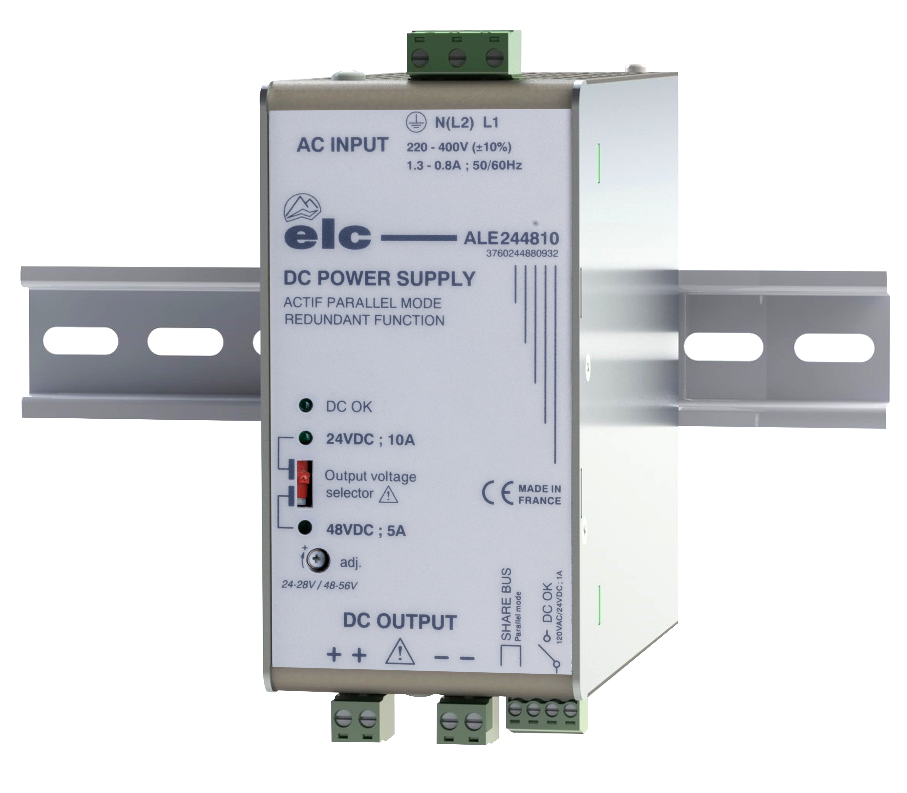 This is ALE Linear Power Supply DIN Rail Power Supply 230V → 440V ac ac Input 24 → 48V dc dc Output 10A Output 240W manufactured by ELC. The manufacturer part number is ALE244810. It has 24 → 48v dc of output voltage adjustment range. Load Regulation - 5mv. It has a/an dc output voltage . The given dimensions of the product include 65 x 135 x 124mm. The product is available in din rail mount configuration. The product ale, is a highly preferred choice for users. Its electrical phase configuration includes 1. In addition, the height is 124mm. Carries 5mv ripple and noise. The product comes in 135mm depth. Its input voltage is 230v → 440v ac. It has ac input voltage. Features a 24 → 48v dc output voltage. While its minimum temperature is -25°c. It has a model din rail. It comes in linear power supply configuration. It carries 10a output current.