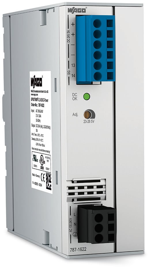 This is 787 Switched Mode Switching Power Supply 230V ac ac Input 24V dc dc Output 5A Output 120W manufactured by WAGO. The manufacturer part number is 787-1622. Additionally, the product is supplied with 1 outputs. It has a/an dc output voltage . It carries 5a output current. The product is available in din rail mount configuration. The product 787, is a highly preferred choice for users. It has ac input voltage. In addition, the height is 127mm. Furthermore, the product is 42mm wide. The product comes in 137.5mm depth. Its input voltage is 230v. Features a 24v dc output voltage. It comes in switched mode configuration.