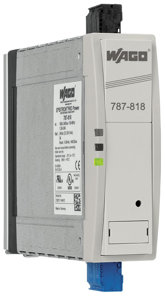 This is 787 Switched Mode Switching Power Supply 230V ac ac Input 24V dc dc Output 3A Output 72W manufactured by WAGO. The manufacturer part number is 787-818. Additionally, the product is supplied with 1 outputs. It has a/an dc output voltage . It carries 3a output current. The product is available in din rail mount configuration. The product 787, is a highly preferred choice for users. It has ac input voltage. In addition, the height is 163mm. Furthermore, the product is 40mm wide. The product comes in 163mm depth. Its input voltage is 230v. Features a 24v dc output voltage. It comes in switched mode configuration.