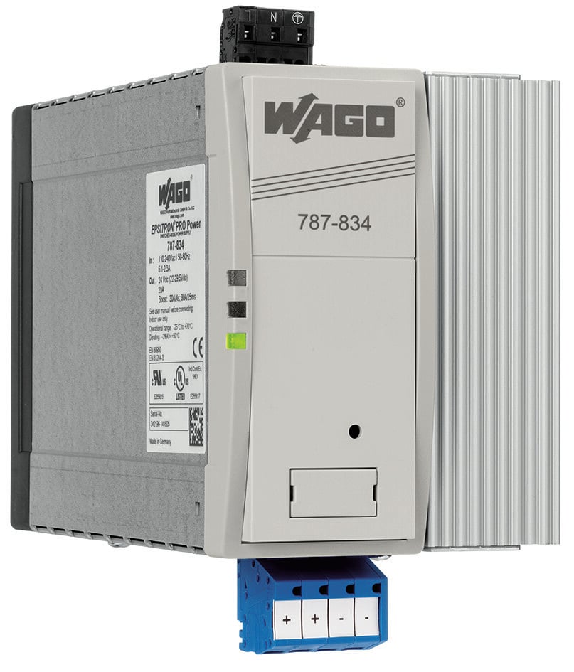 This is 787 Switched Mode Switching Power Supply 230V ac ac Input 24V dc dc Output 20A Output 480W manufactured by WAGO. The manufacturer part number is 787-834. Additionally, the product is supplied with 1 outputs. It has a/an dc output voltage . It carries 20a output current. The product is available in din rail mount configuration. The product 787, is a highly preferred choice for users. It has ac input voltage. In addition, the height is 171mm. Furthermore, the product is 97mm wide. The product comes in 187mm depth. Its input voltage is 230v. Features a 24v dc output voltage. It comes in switched mode configuration.