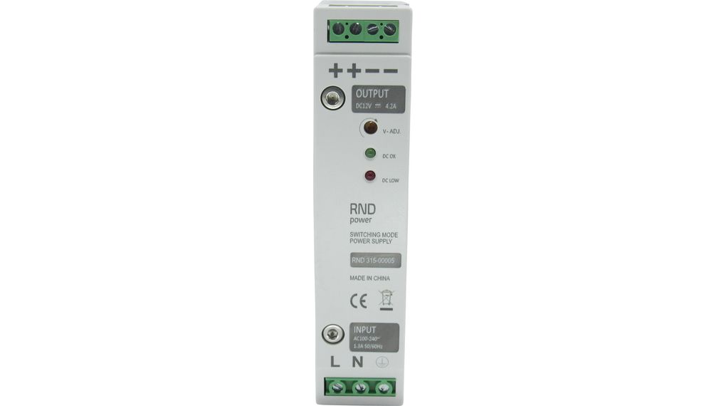 This is 315 Switched Mode DIN Rail Power Supply 100 → 240V ac ac Input 12V dc dc Output 4.2A Output 50W manufactured by RND. The manufacturer part number is RND 315-00005. It has a/an dc output voltage . It carries 4.2a output current. The product rnd 315, is a highly preferred choice for users. It has ac input voltage. Its input voltage is 100 → 240v ac. Features a 12v dc output voltage. It comes in switched mode configuration.