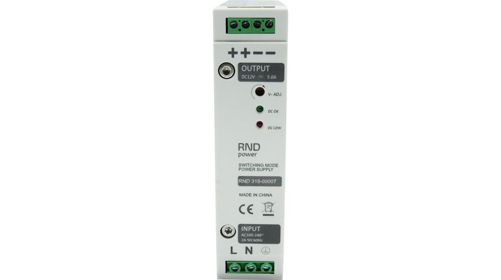 This is 315 Switched Mode DIN Rail Power Supply 100 → 240V ac ac Input 12V dc dc Output 5A Output 70W manufactured by RND. The manufacturer part number is RND 315-00007. It has a/an dc output voltage . It carries 5a output current. The product rnd 315, is a highly preferred choice for users. It has ac input voltage. Its input voltage is 100 → 240v ac. Features a 12v dc output voltage. Feature 70w of power rating. It comes in switched mode configuration.