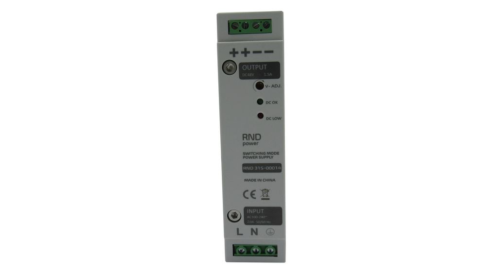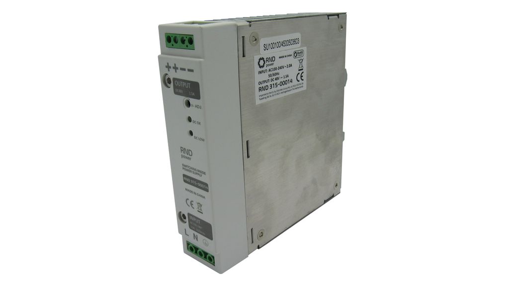 This is 315 Switched Mode DIN Rail Power Supply 100 → 240V ac ac Input 48V dc dc Output 1.5A Output 70W manufactured by RND. The manufacturer part number is RND 315-00014. It has a/an dc output voltage . It carries 1.5a output current. The product rnd 315, is a highly preferred choice for users. It has ac input voltage. Its input voltage is 100 → 240v ac. Features a 48v dc output voltage. It comes in switched mode configuration.
